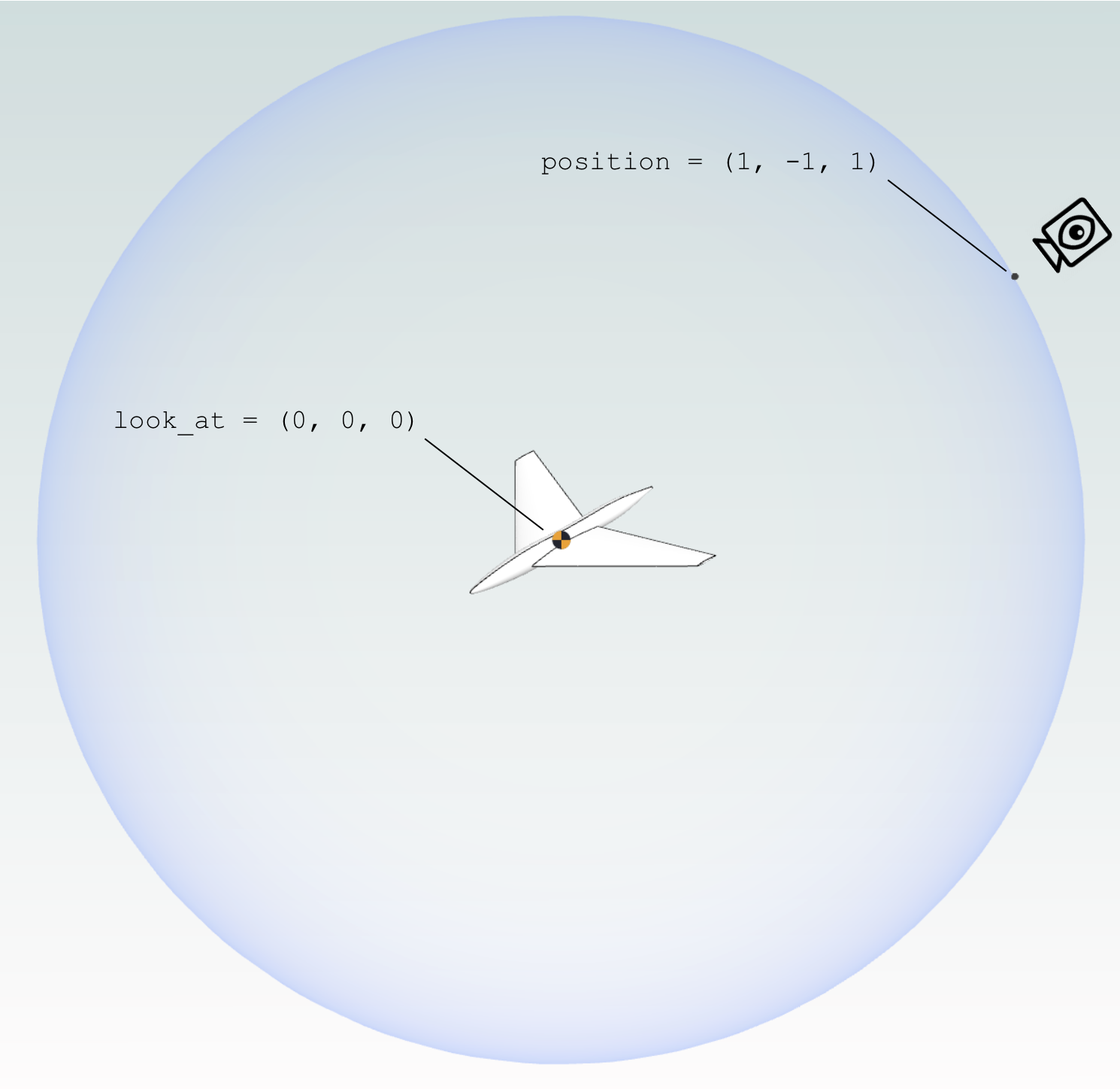 position: The camera’s eye position in 3D space. Think of it as a point on a sphere looking inward toward