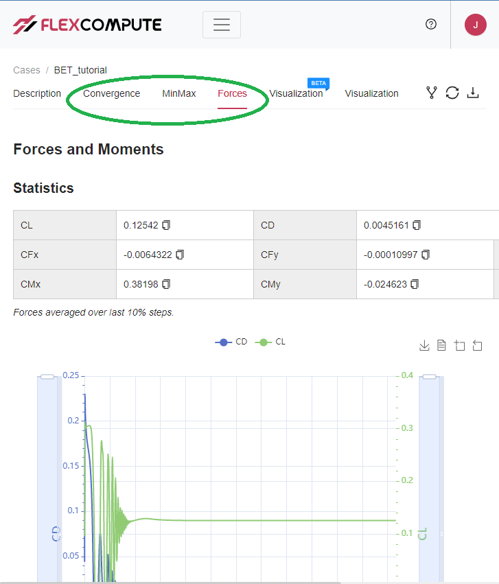 Except for the data contained within “bet_forces.csv” and “actuatorDisk_output.csv”, all the downloadable data mentioned above can be visualized on the WebUI under the Convergence, MinMax and Forces tabs as outlined below.