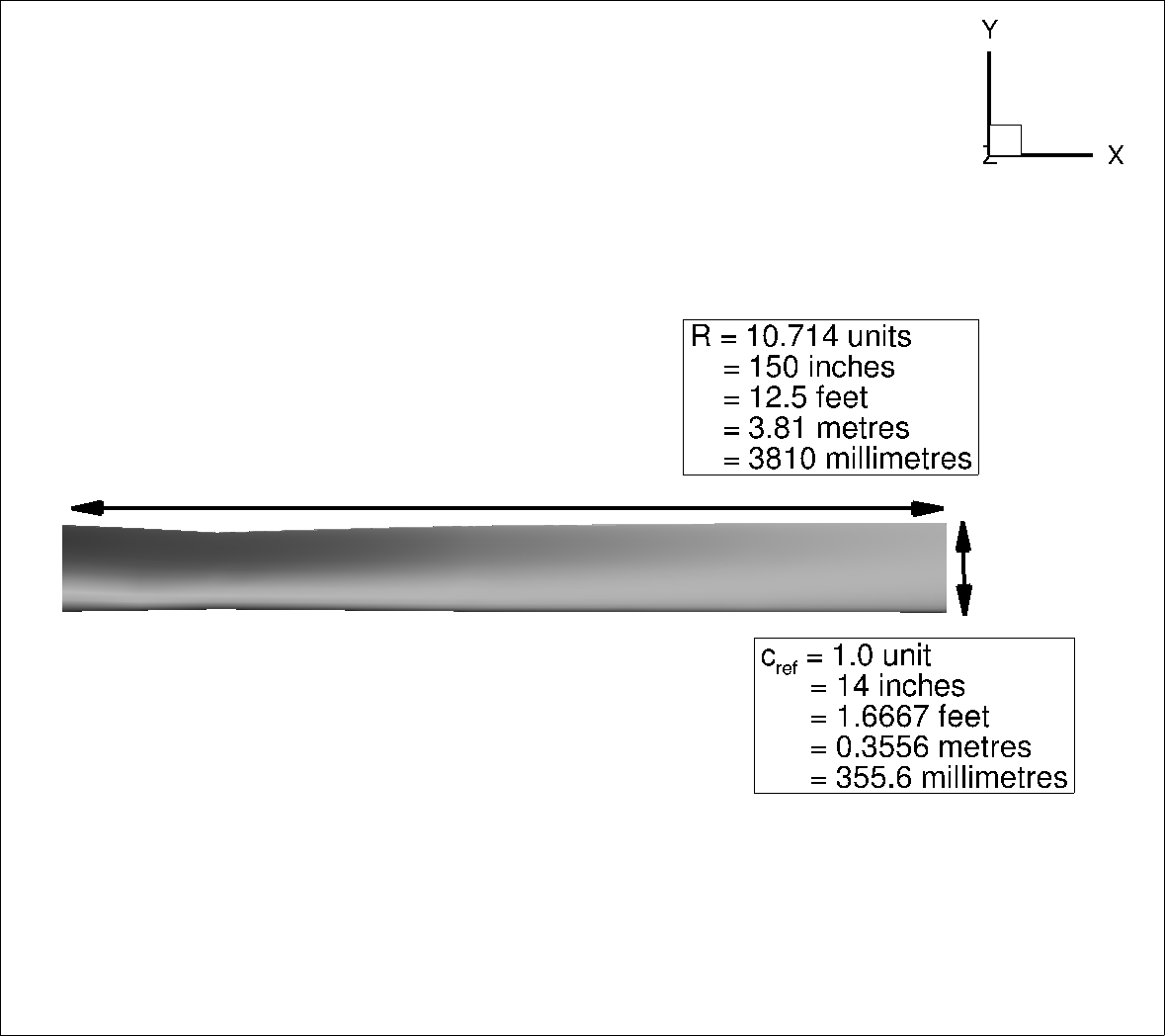 Firstly, the Flow360 json file input calculations are demonstrated for three different cases using different \(L_{gridUnit}\) values. The \(L_{gridUnit}\) value is defined as the physical length represented by unit length in the given mesh file. Since the Flow360 solver is nondimensional, the \(L_{gridUnit}\) value is used to scale all length inputs. This allows the user to construct a mesh in any desired unit. Typical units are: meters, millimeters, feet, inches or reference chord lengths. However, care must be taken when calculating input values such as Reynolds number or rotational speed, omega, to ensure that the same solution is obtained across different mesh scales. The \(L_{gridUnit}\) values for commonly used mesh units are shown in Table 7.2.1