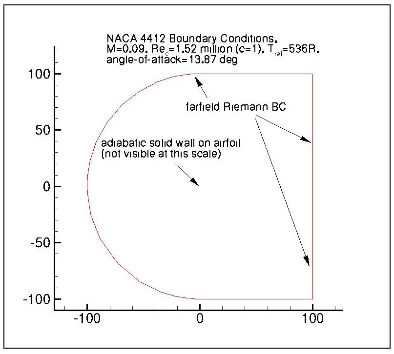 A farfield Riemann boundary condition is used which is placed 100 chords away from the airfoil. The flow conditions were set to 1.52 million Reynolds number and a Mach number of 0.09. The study was performed for an angle of attack of 13.87 degrees. A reference temperature of 297.778K was used. Fully-turbulent calculations were performed with the ratio of the freestream value of the SA turbulence field variable (relative to laminar) set to 3, set in Flow360 as a turbulent viscosity ratio of 0.210438. For the k- ω SSTm calculations a turbulent viscosity ratio of 0.009 was used. Fig. 5.2.2 shows the case layout in detail, whereas the solver inputs are summarized in Table 5.2.1.