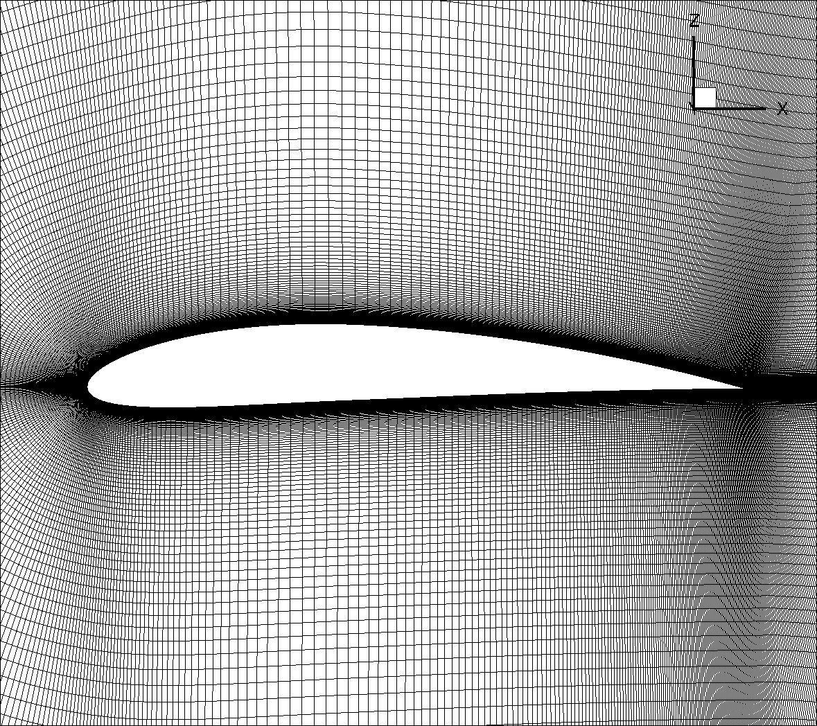 A single C-Topology grid is used, available at the NACA4412 case grid download page of the TMR website. The second finest grid (897 by 257 points) is used to perform direct comparisons with CFL3D and FUN3D on the same grid. The grid used in Flow360 was modified for the names and number of boundaries, and is available here A detailed grid convergence study is not performed here. The grid far-view and near-view is shown in Fig. 5.2.1.