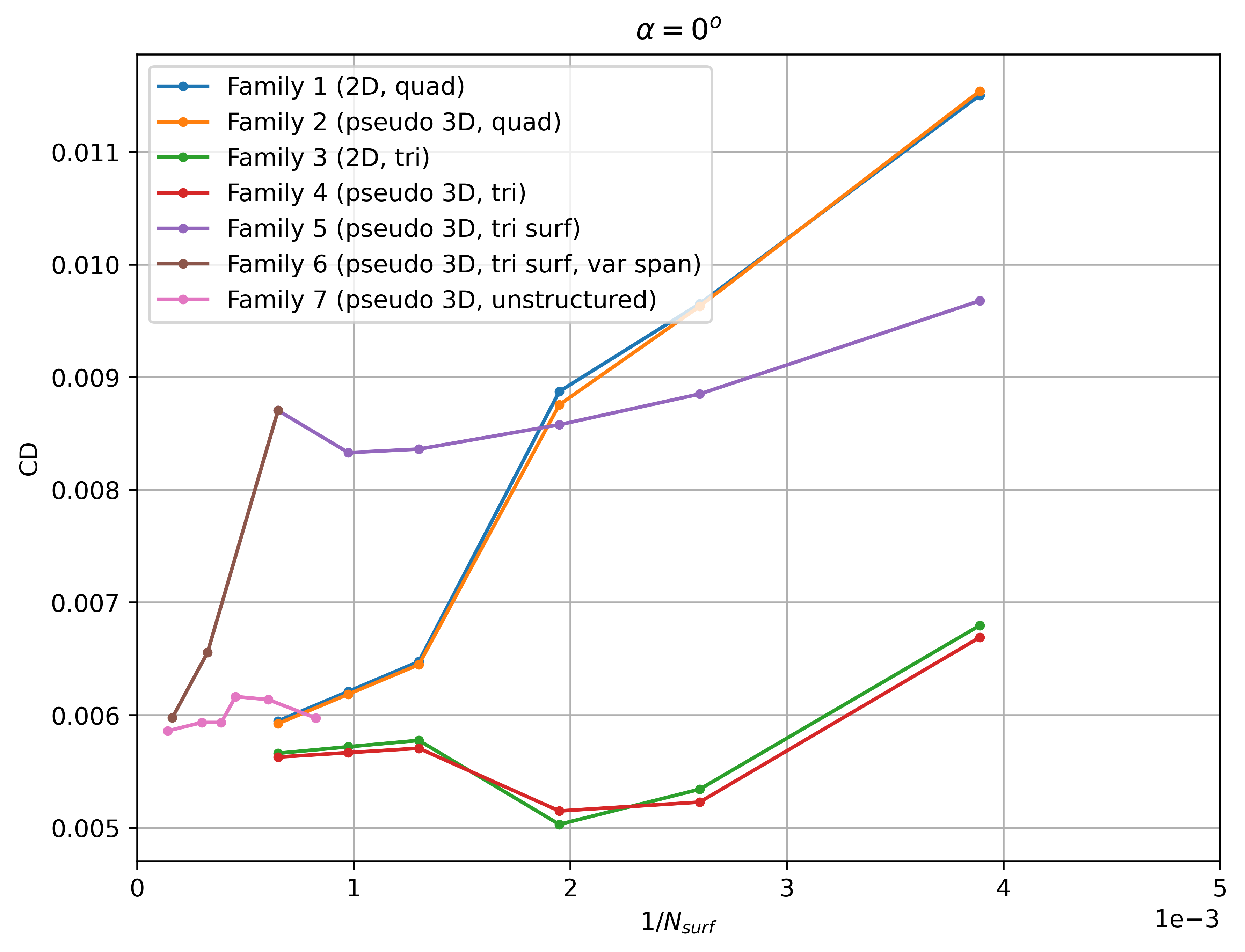 Fig. 5.4.12 Convergence of the drag coefficient with mesh refinement at \(\alpha = 0^o\) for 7 different grid families.#