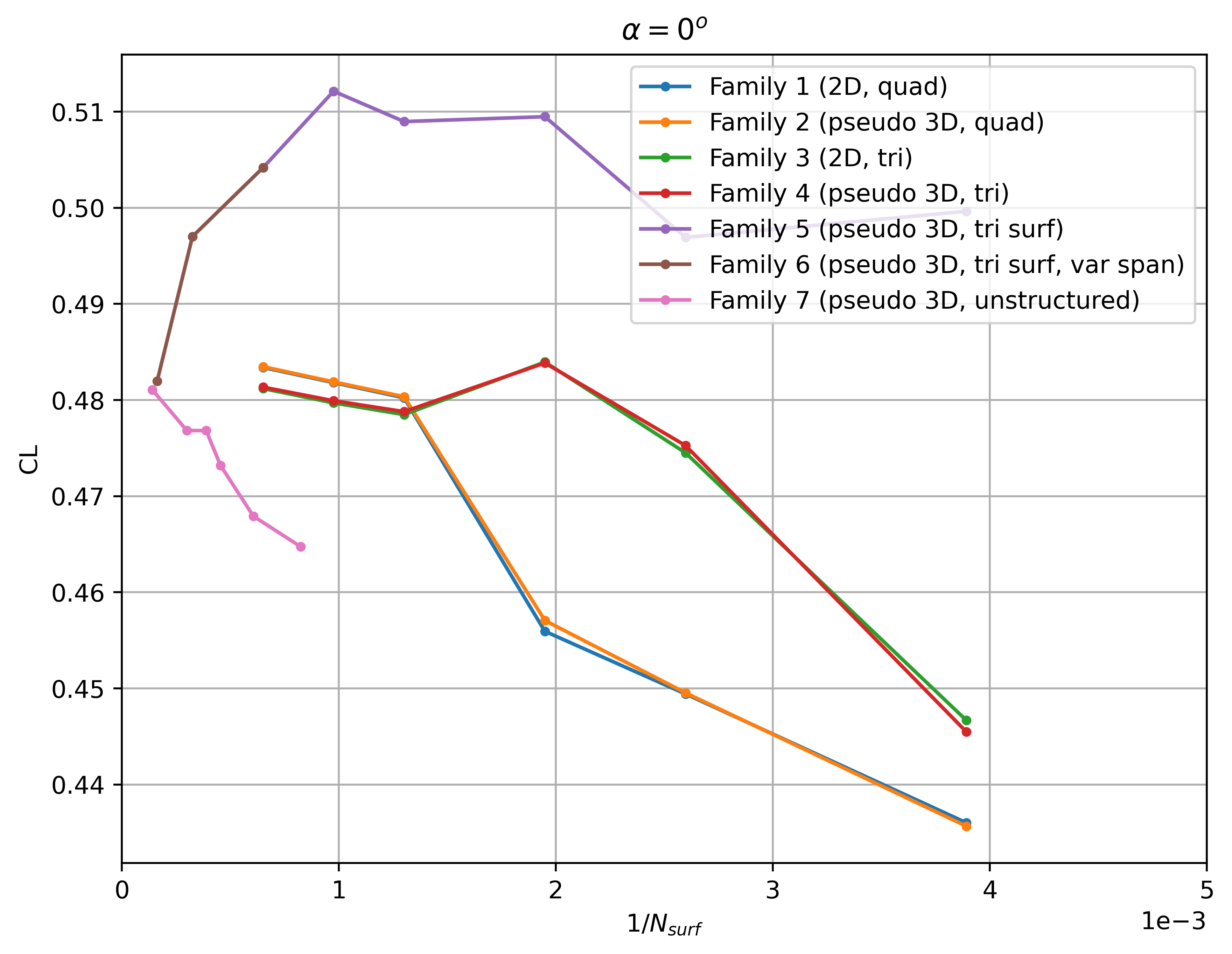 As can be seen from the table above, the pseudo-3D cases require significantly more grid points than the pure 2D cases. The triangular surface grids (Families 5-7) require fewer points for a given grid level primarily due to the fact that they were generated using an unstructured solver, not spanwise extrusion, hence the number of spanwise nodes in the volume typically reduces closer to the farfield. Grid Family 6 contains an increase in spanwise nodes up to 80 for level 3. A grid of 40 nodes in the spanwise direction was also generated for the grid Family 2 but not shown in the Table (25,025,088 nodes). Grid Family 7 contains significantly more nodes than Family 5 even though the spanwise spacing was reduced to 0.04, which is primarily due to the aspect ratio constraint of 25 for these grids. In the mesh convergence study, the metric used along the x-axis is 1 over the number of surface nodes. As the number of chordwise nodes will be more important than the number of spanwise nodes, the number of surface nodes is divided by 20 for pseudo-3D cases (to align Families 1 and 2, 3 and 4 on the x-axis).