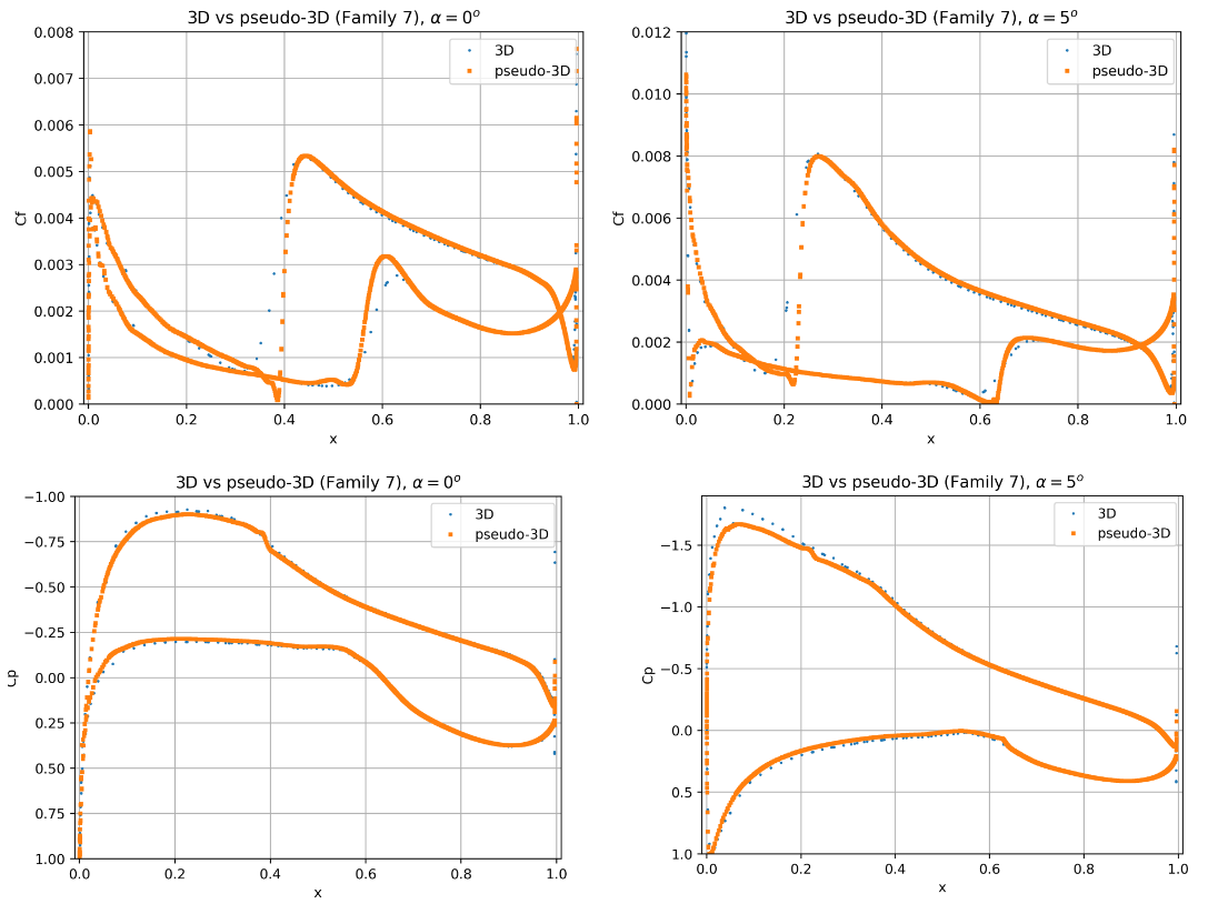 Next 2D versus pseudo-3D predictions are analysed in greater detail. The skin friction distributions are compared between Family 1 and Family 2 as well as Family 3 and Family 4 at two mesh levels, shown in Fig. 5.4.18.