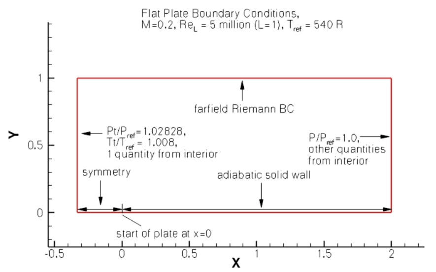 The flat plate case is based on the model verification case available on the NASA TMR website. The freestream Mach number is equal to 0.2 with the Reynolds number per unit length equal to 5 million. The boundary conditions applied are based on the Flat Plate TMR Case as shown in Fig. 5.4.1.