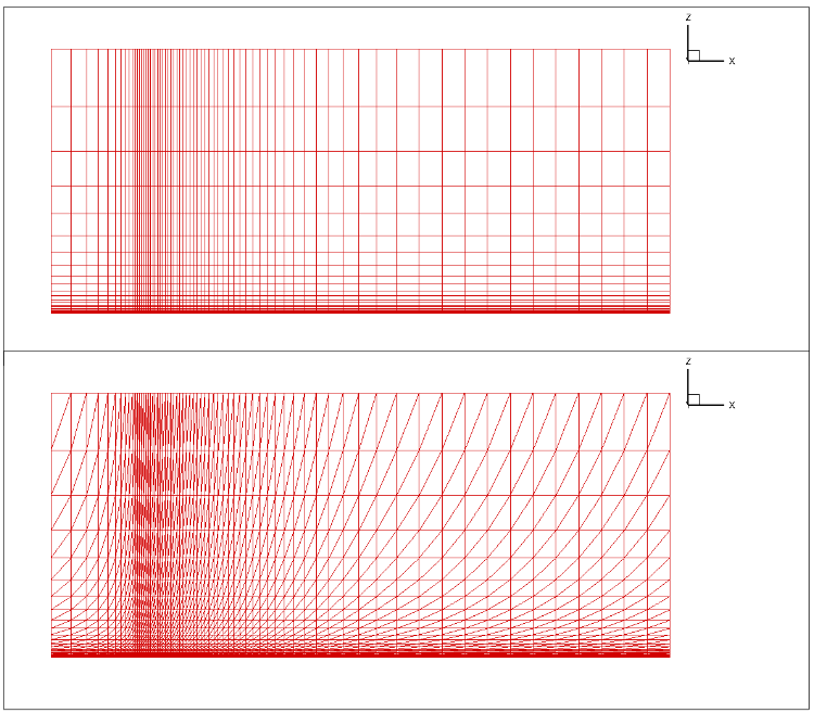 Fig. 5.4.2 Comparison of the quad (top) and tri (bottom) grids for the flat plate case.#