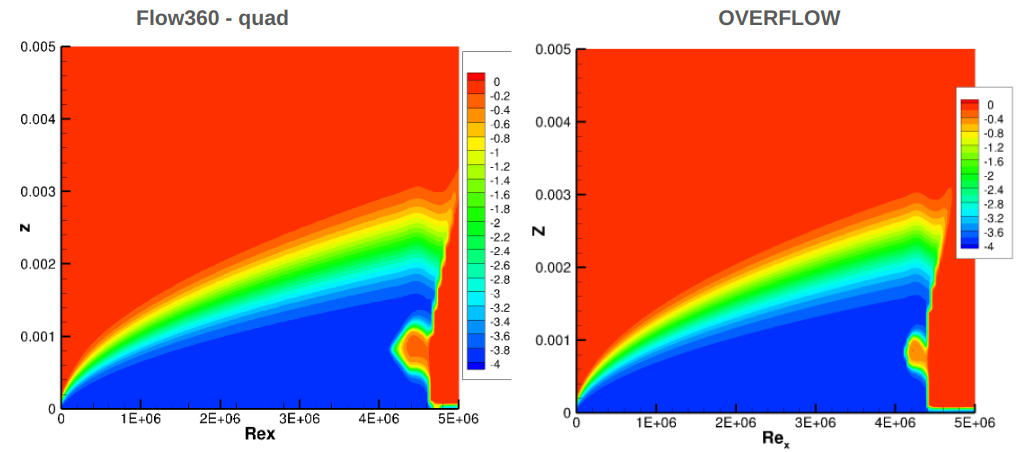 Fig. 5.4.5 Comparison of the modified intermittency contours between Flow360 and OVERFLOW for flat plate case on the finest grid.#