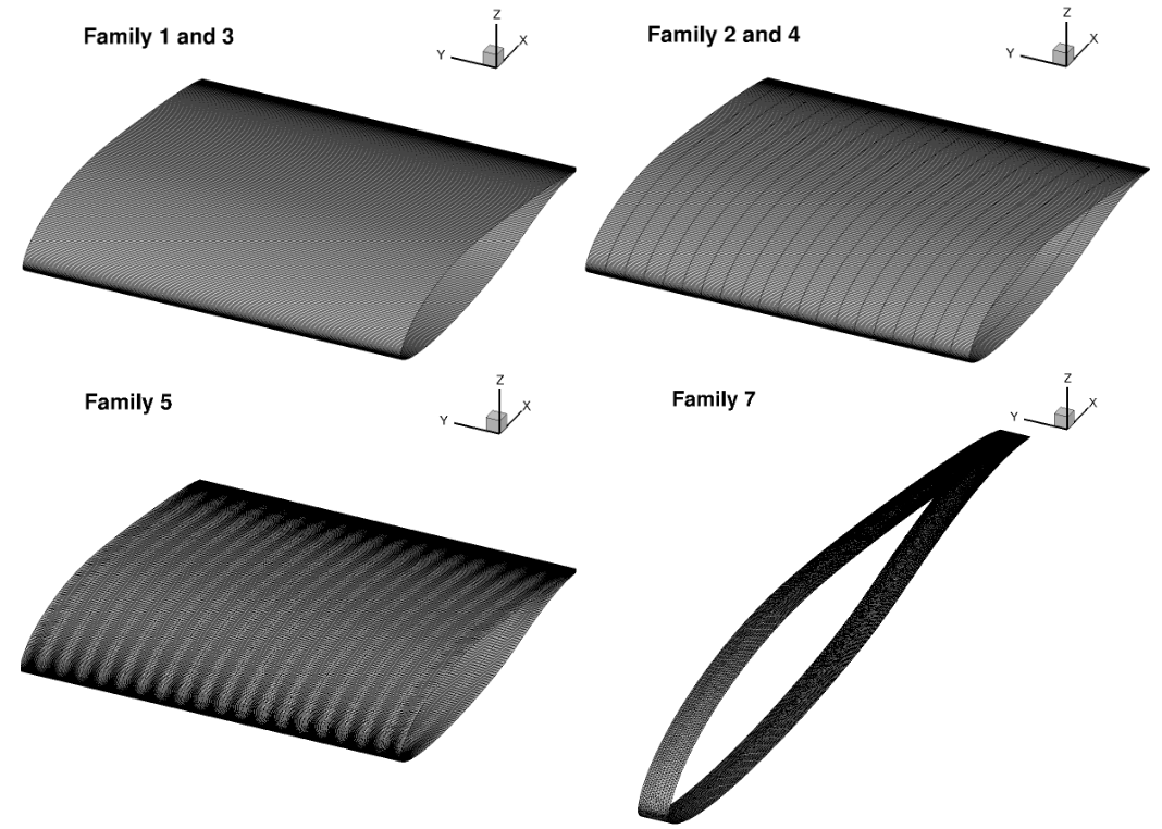 As mesh sensitivity effects are of interest to provide best-practice guidelines, multiple grid families are generated for the mesh convergence study. The primary aims are to establish whether 2D simulations are valid when compared to pseudo-3D and 3D simulations for transition predictions, and what element types should be used on the surface and in the volume mesh to reduce grid sensitivity effects. For this purpose, the following grid families are generated, with further details provided below: