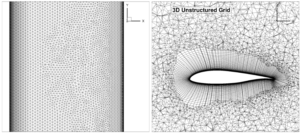 It is clear from the volume grid visualizations that the grid Family 7 is a much higher quality unstructured grid than grid Family 5 though a higher number of nodes was used. This is primarily due to the fact the grid Family 5 has 20 nodes across a spanwise length of 1 chord, leading to high aspect ratio cells. Furthermore, there is little control over the volume grid in the mid section of the airfoil.