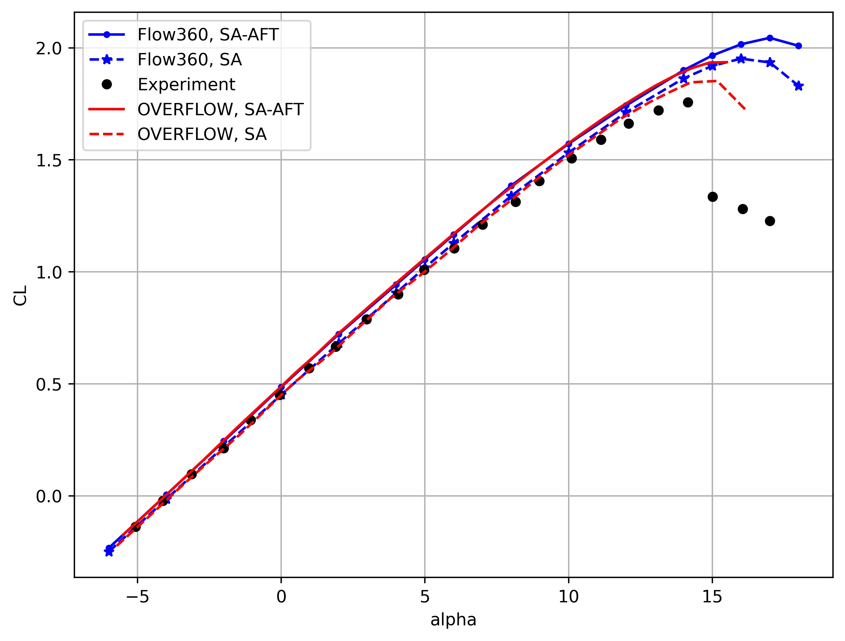 The alpha sweep results also show good correlation of Flow360 results with OVERFLOW and experimental data. The lift coefficient is slightly overpredicted compared to experiments at a given angle of attack, with excellent agreement with OVERFLOW predictions for both the SA and SA-AFT models. The Flow360 drag polar also shows very good agreement with both experimental data and OVERFLOW results, although the curve is underesolved due to simulations at 2 degree increments in alpha. Both Flow360 and OVERFLOW predict a slightly narrower drag bucket than experiments. The SA-AFT drag polar shows the importance of including transition modeling for the present case, as the drag is overpredicted when using the SA model. Furthermore, DES-based (Detached Eddy Simulation) turbulence modeling is recommended for simulations past stall, as the RANS-based solutions overpredict the lift coefficient at high angles of attack for both Flow360 and OVERFLOW cases.