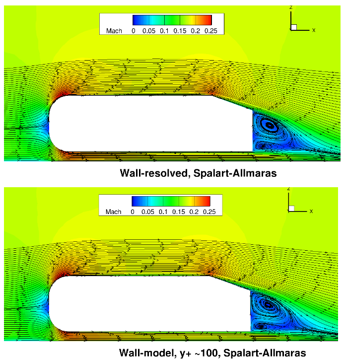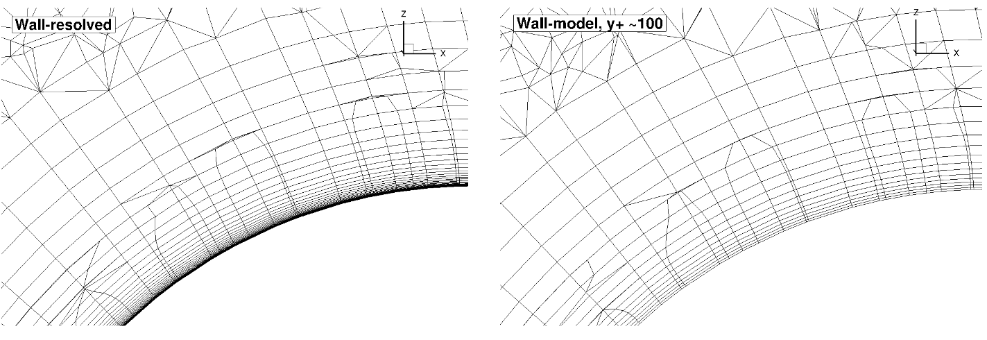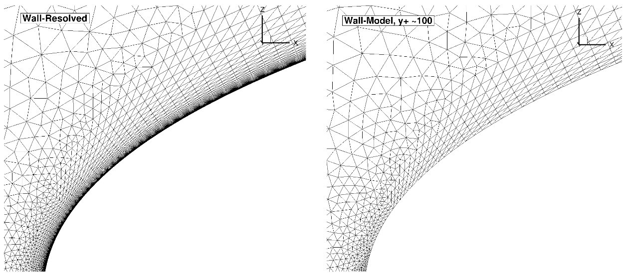 For the Windsor body cases, the number of anisotropic layers was adjusted manually. 25 layers were used for the wall-resolved simulations, which were gradually reduced to 9 layers for the mesh with the highest wall spacing. Here, the differences in the mesh near the wall can be seen clearly, with a prism layers extending deeper into the domain for the wall model grid. For the same height of the anisotropic region, even more layers would need to be used for the wall-resolved mesh. Compared to the automotive prediction workshop grids, no attempt was made at refining the mesh at the rear of the car, as the focus here is on evaluating the wall model rather than direct comparisons with experimental data. The wall model grid shown above, leads to a reduction in node counts from 7.3 million to 3.1 million nodes. The simulations were performed using both the Spalart-Allmaras and \(k-\omega\) SST turbulence models. The CFL number was ramped up from 1 to 200 over 2000 pseudo-steps with a total number of pseudo-steps equal to 10000, even though in many cases, fewer pseudo-steps could have been used. Tests showed that even higher CFL numbers could have also been used, with the wall model simulations showing slightly better convergence properties with increasing wall spacing.