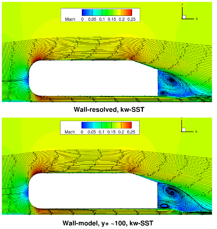 Qualitatively, the flowfield streamlines show excellent agreement between wall-resolved and wall-modeled simulations for both examined turbulence models. Although the flow at the back of the car, was not the focus of this study, similar flow features are observed with a larger and smaller recirculation region present. The highly consistent flowfields highlight the applicability of the wall model to automotive applications.
