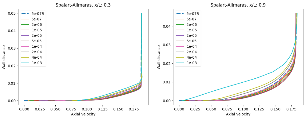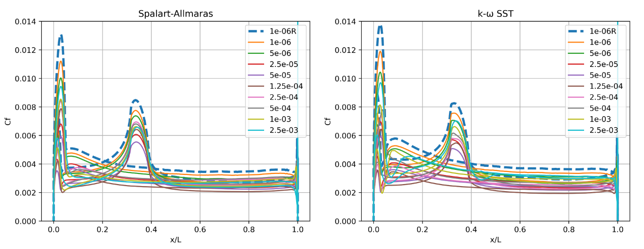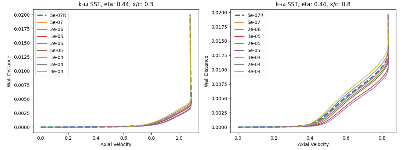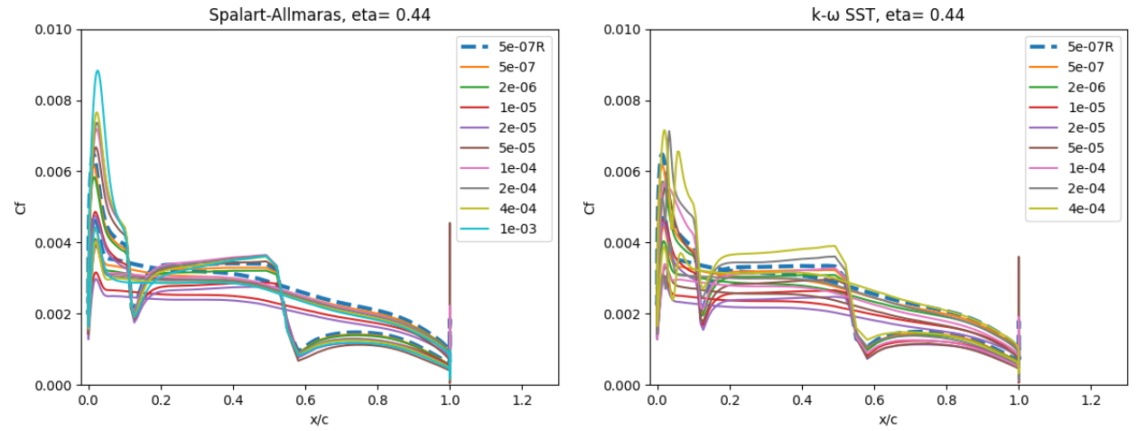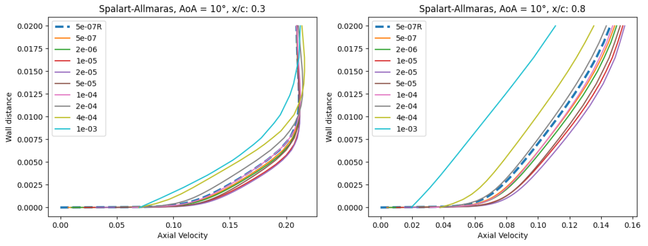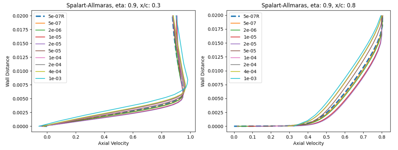 As the wall spacing increases, the drag value is minorly underpredicted compared to the wall-resolved simulations, with the difference staying within 10% for the first two wall spacings. As the wall spacing is increased further, the error on the drag prediction increases, until spacings of 0.0002-0.0004 are reached, above which the error significantly reduces. Similar trends are observed between the Spalart-Allmaras and \(k-\omega\) SST turbulence models, although the error on the drag prediction appears to be slightly higher for the \(k-\omega\) SST turbulence model across nearly all wall spacings. At very high wall spacings, the \(k-\omega\) SST model appears to perform better than the Spalart-Allmaras model. To analyse these findings further, we first look at the \(y+\) and skin friction distributions, shown in Fig. 5.5.3-Fig. 5.5.4. A boundary layer profile in wall units according to the Law of the wall is also shown in Fig. 5.5.5 to aid the discussion.