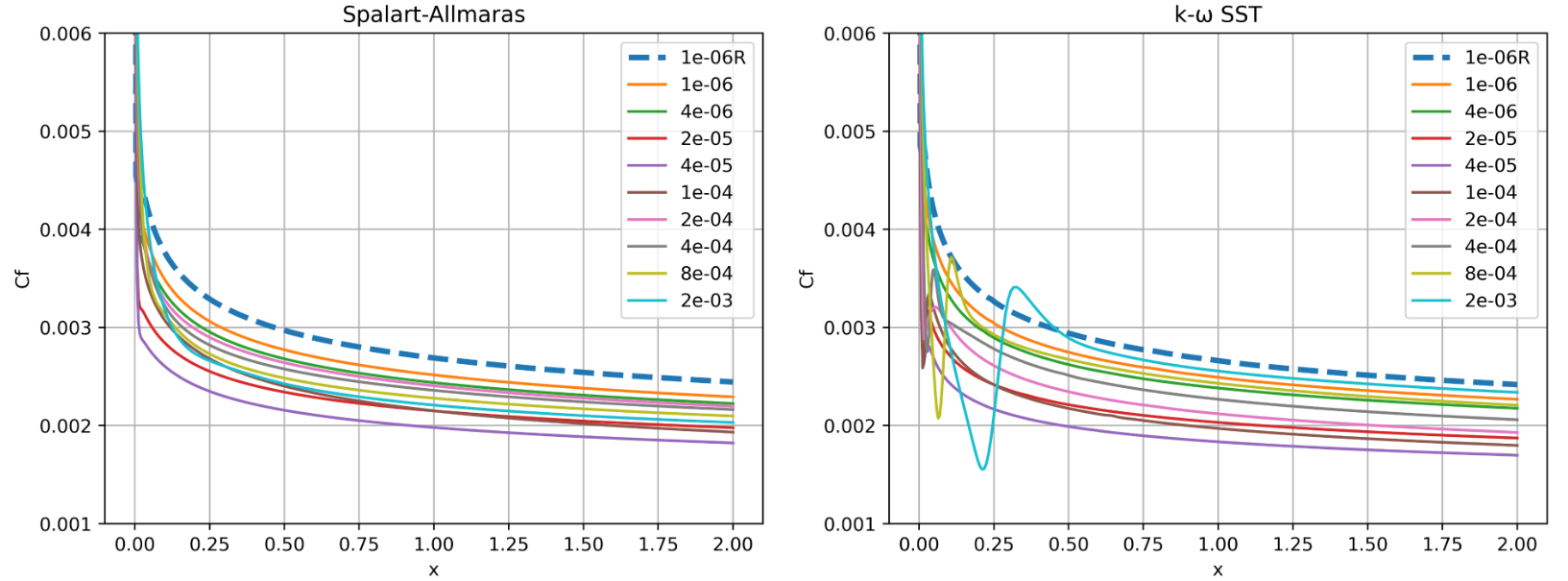 As the number of points in the wall normal direction is fixed, the wall-model grid has a finer spacing away from the boundary layer due to the higher wall-normal spacing at the flat plate. The simulations were performed using both the Spalart-Allmaras and \(k-\omega\) SST turbulence models. The CFL number was ramped up from 1 to 500 over 2000 pseudo-steps with a total number of pseudo-steps equal to 5000.