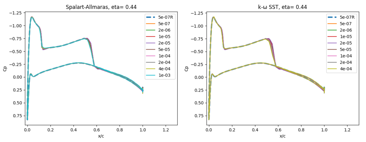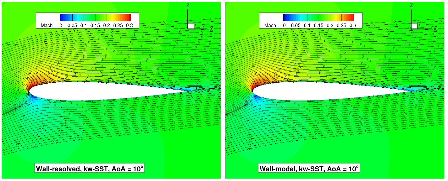 The volumetric grids for the wall-resolved and wall-model grids look fairly similar when looking at the grid around the entire aerofoil. The wall-model grid for a \(y^+\) of the 100, however, has fewer anisotropic layers, leading to a node count of 26,180 nodes (resolved grid is 59,654). The means that the computational cost on the wall-model grid will be less then half (additionally convergence will be faster due to a larger minimum volume). The simulations were performed using both the Spalart-Allmaras and \(k-\omega\) SST turbulence models. The CFL number was ramped up from 5 to 200 over 2000 pseudo-steps with a total number of pseudo-steps equal to 10000, even though in many cases, fewer pseudo-steps could have been used.