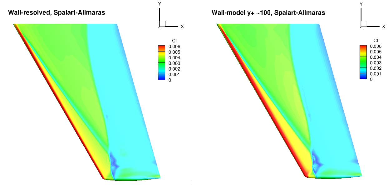 The use of the wall model typically has minor impact on the surface pressure prediction, but will lead to an error on the skin friction distributions. Generally, however, the skin friction trends are well captured based on the examined cases.