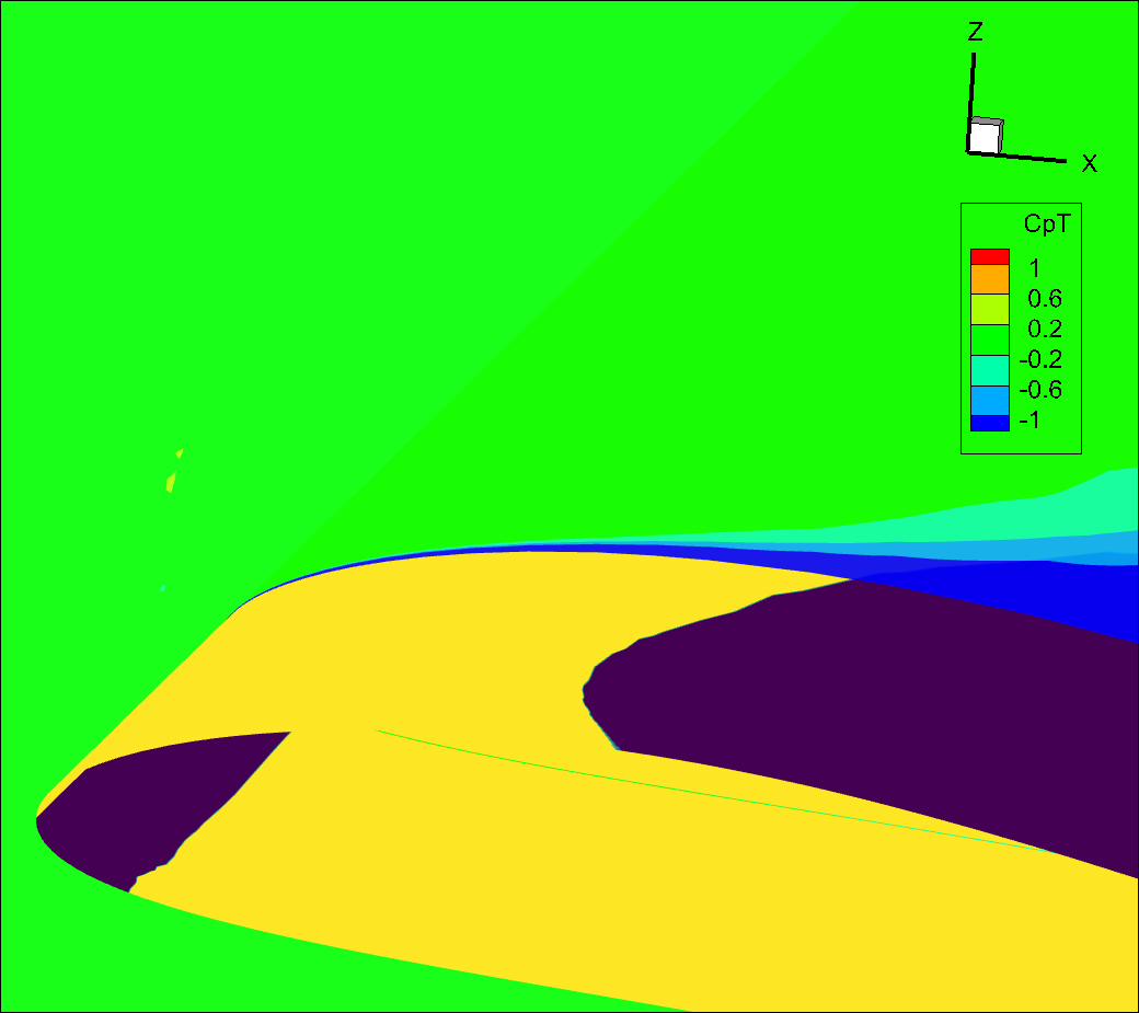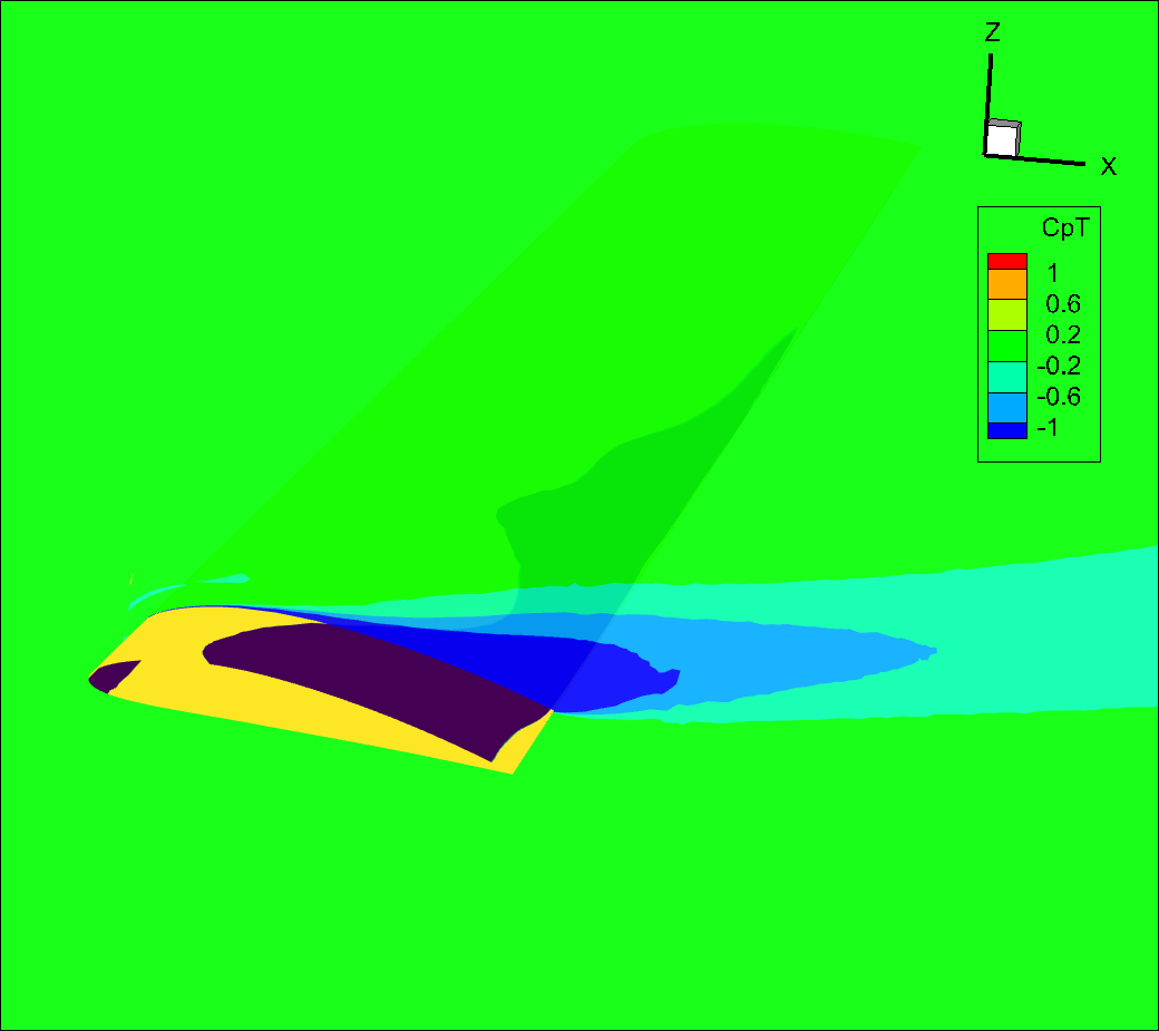 Fig. 7.1.4 Slice of total pressure coefficient showing separation region on a partially stalled wing.#