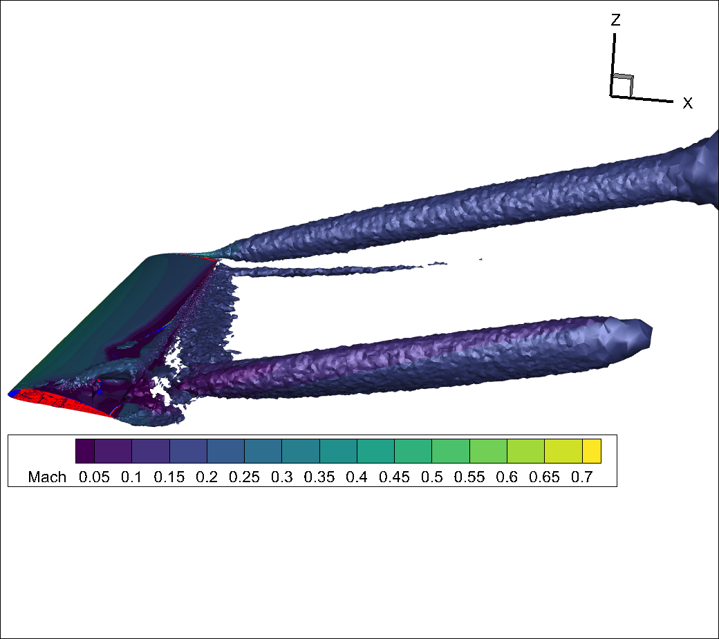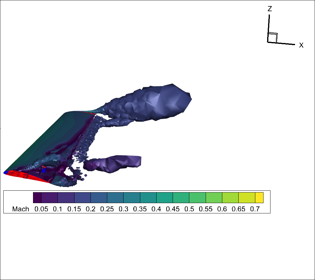 Fig. 7.1.6 qcriterion isosurface showing strong tip vortex and vortices escaping from the separation region.#