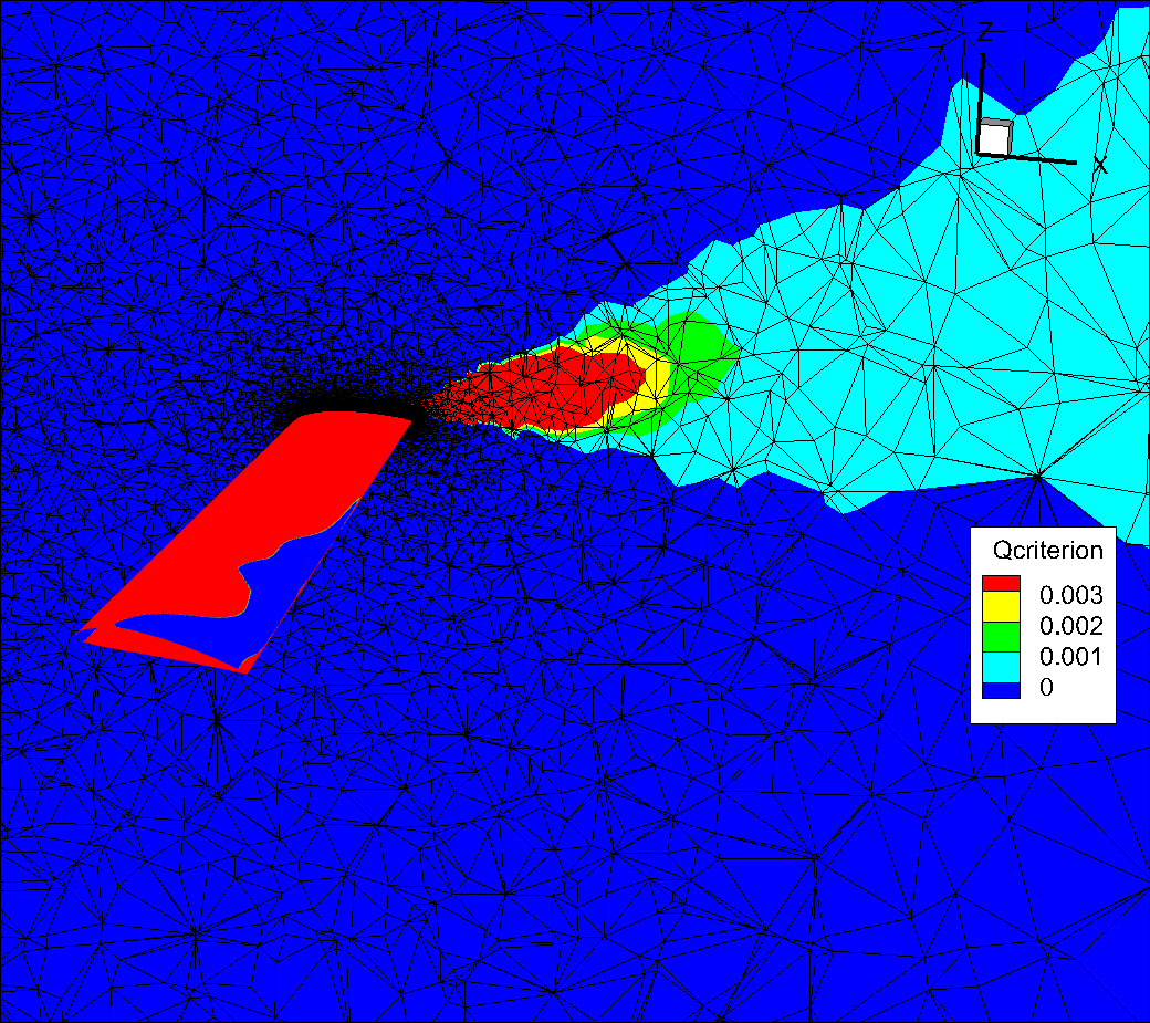 Fig. 7.1.7 Slice showing the volume mesh. Notice how quickly the mesh coarsens as we move away from the wing and how that affects the qcriterion values.#