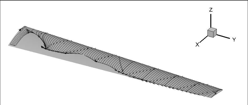 Fig. 7.1.2 The x-component of skin friction coefficient showing the attached (yellow) and separated (dark purple) flow regions on this wing at a high angle of attack.#