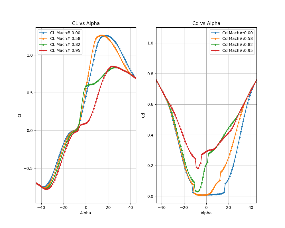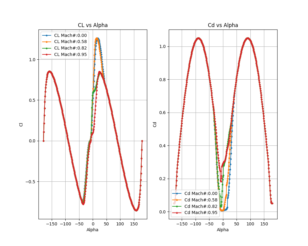 Sample Cl and Cd polars for various mach numbers showing good continuity across the whole range of alphas = -180 ° to +180 °#