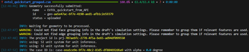 By starting from the same evtol_quickstart_grouped.csm file as we have downloaded in the above geometry upload section, The EVTOL quickstart case shown previously can be easily launched using the following code: