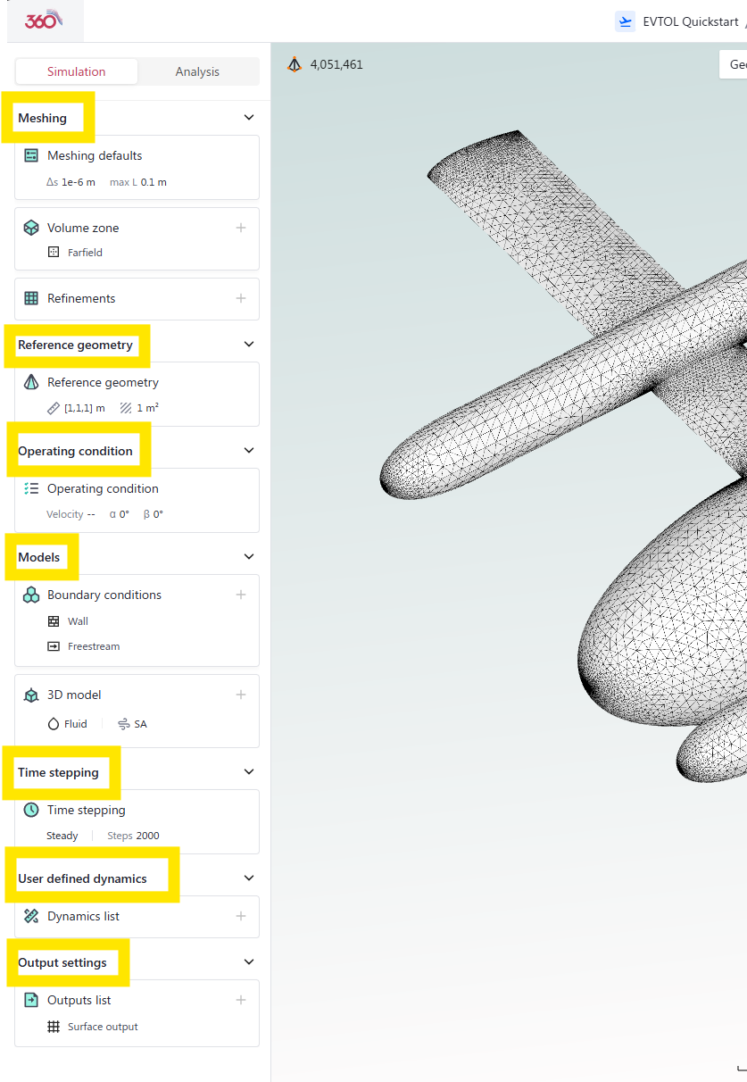 Accessing the project tree. Notice the volume mesh node count on the upper left of the window.#