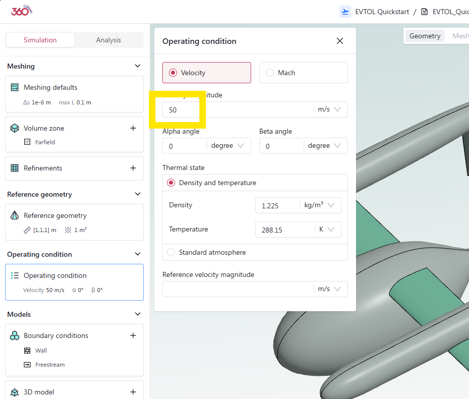 To rectify this, letโs click on the Operating Condition section and update the velocity to 50 m/s. The default \({\alpha}\) and \({\beta}\) flow angles along with more fluid properties can also be modified but we will leave them as they are.