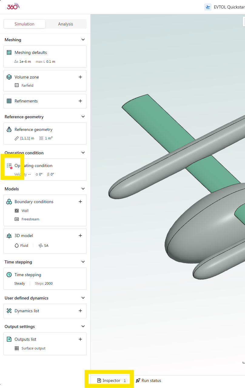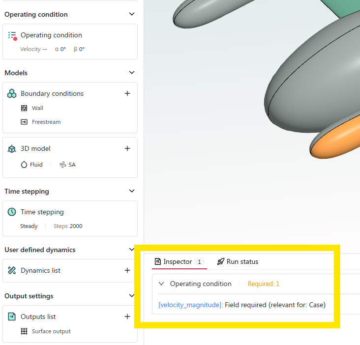 For the Operating Condition, you will notice a little red dot pointing out that some values are missing. The inspector window in the bottom left also mentions that we have 1 error. In this case, we are missing a flow velocity value.
