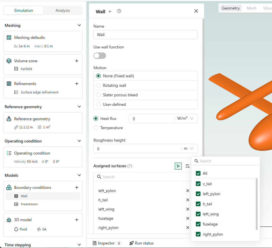 As default we assign a no-slip wall boundary condition to all faces of the model to improve user experience. If needed the user can change the boundary conditions in this section.