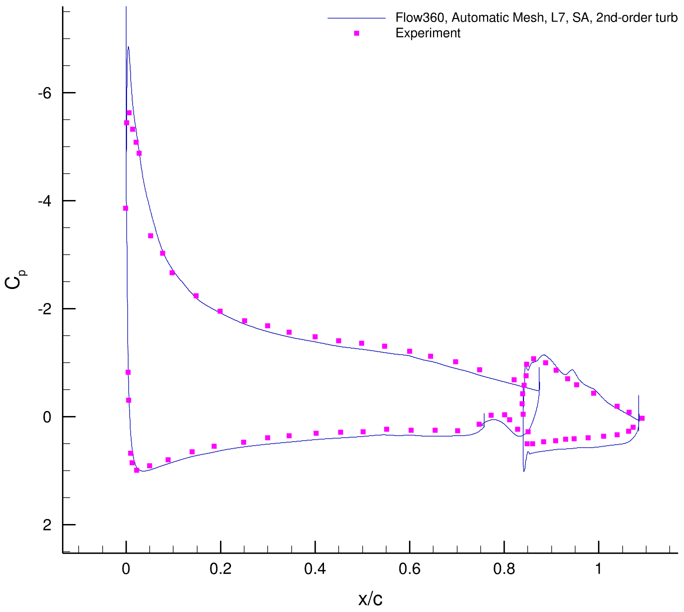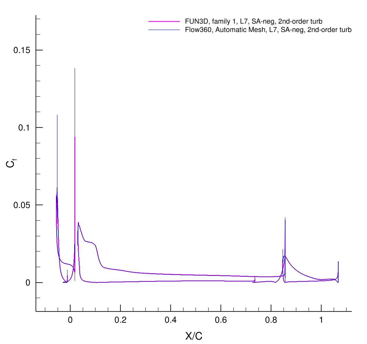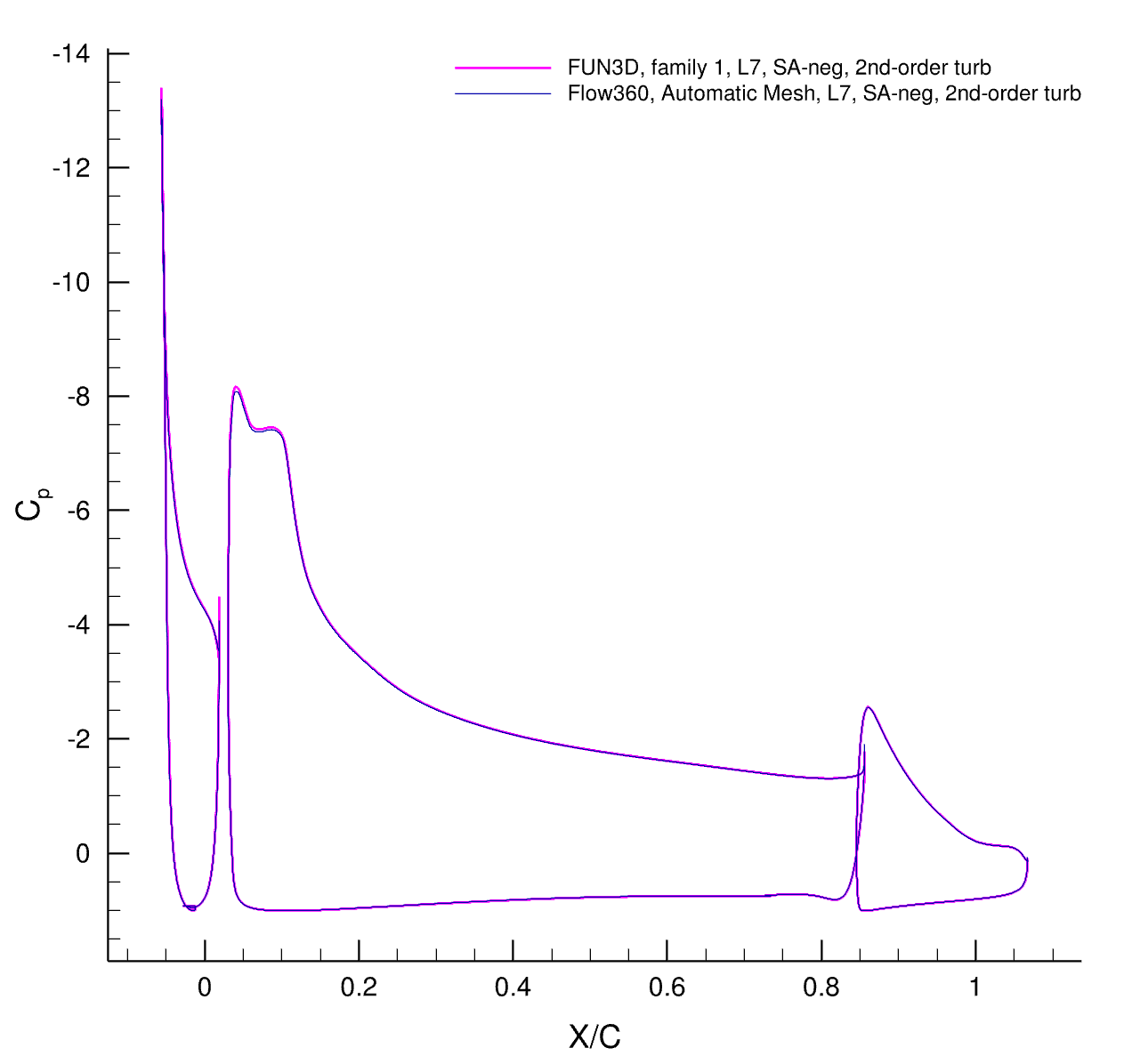 There is no experimental data for this case and we only compare CFD results. The second case is 30P30N High-Lift Configuration, for which we have experimental data to compare to. The third case is the GA(W)-2 airfoil with a 30% fowler flap for which we also have experimental data.