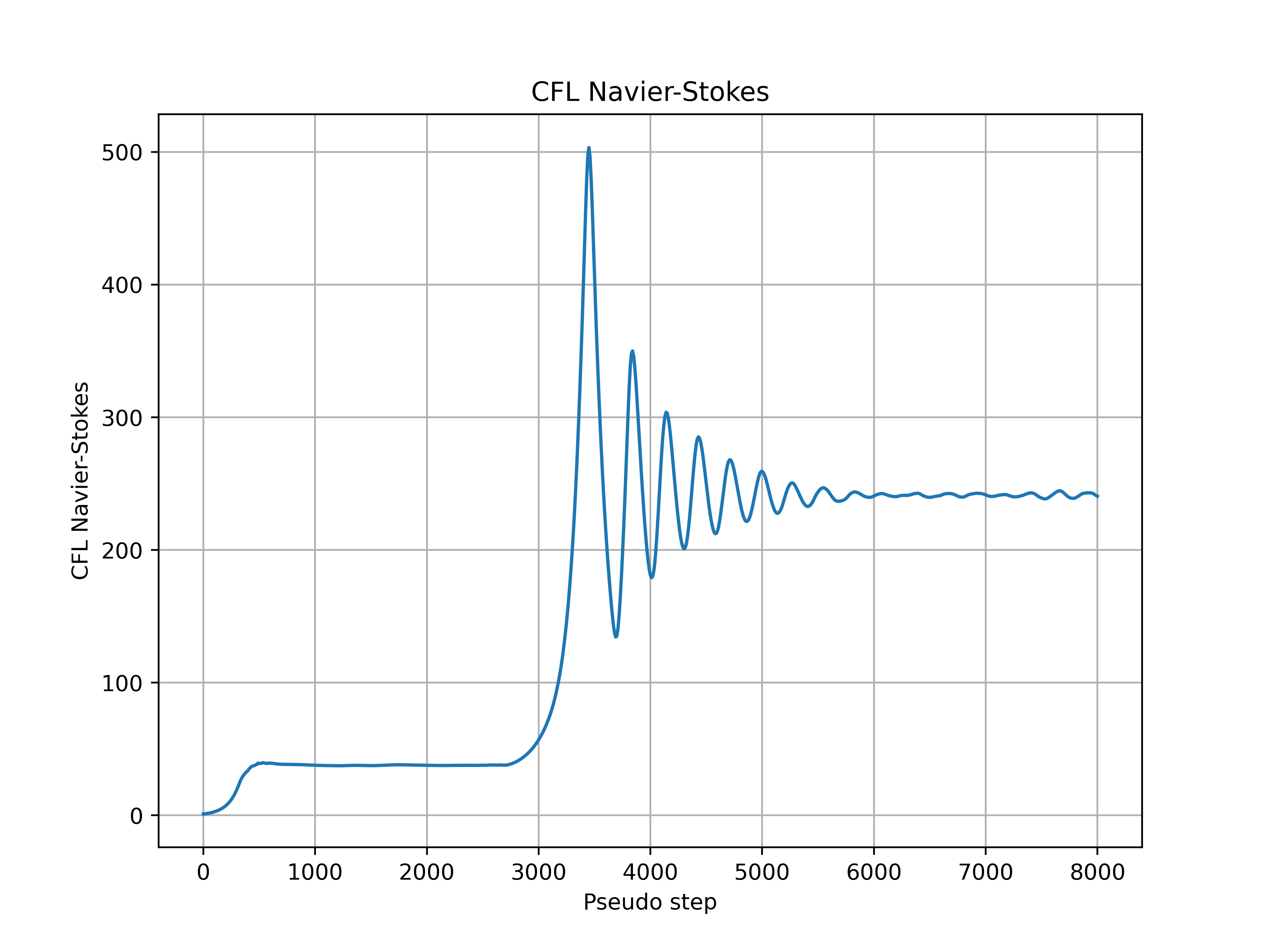 If a simulation starts and runs for some pseudo-steps and then it diverges, as an initial test, users can reduce the initial value of the CFL number to a small value and see if this affects the iteration at which the divergence happens. If the iteration at which the divergence happened changes by decreasing the initial value of the CFL number, this means that the CFL number for this mesh and case configuration must be tuned. Tuning the initial CFL number for a fine mesh can be time consuming. It is recommended to decrease the initial CFL value substantially to help ensure that the early divergence is avoided. Testing initial CFL reductions with a coarse mesh can help as well.