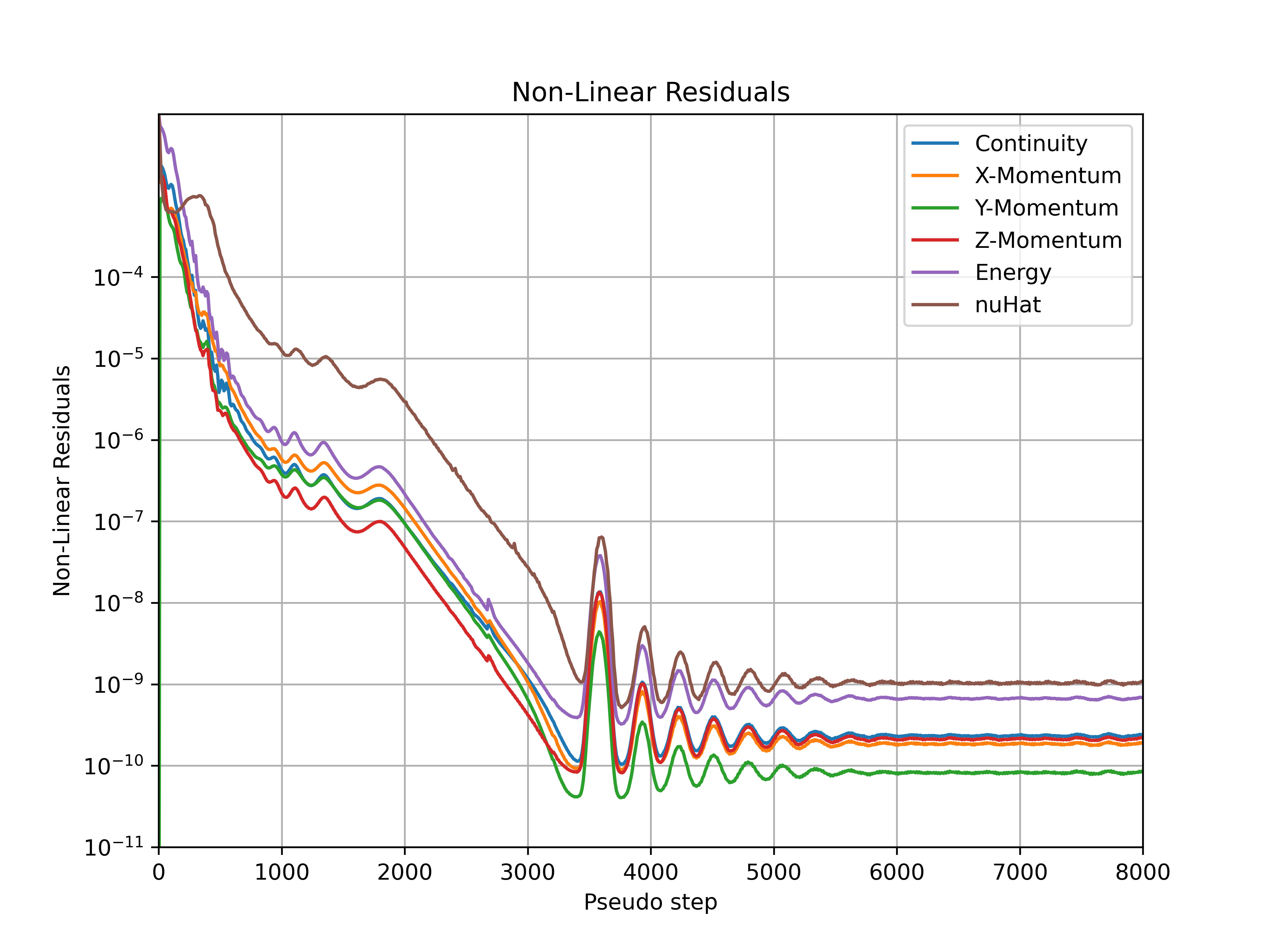 Fig. 7.5.6 Convergence of the nonlinear residuals during the simulation for ONERAM6 wing at 10 degrees alpha.#