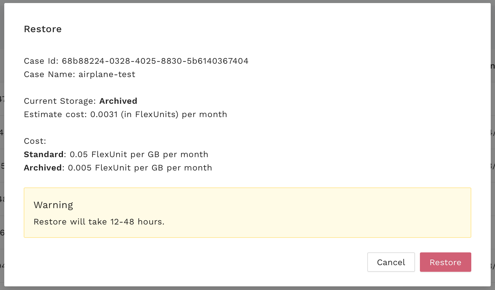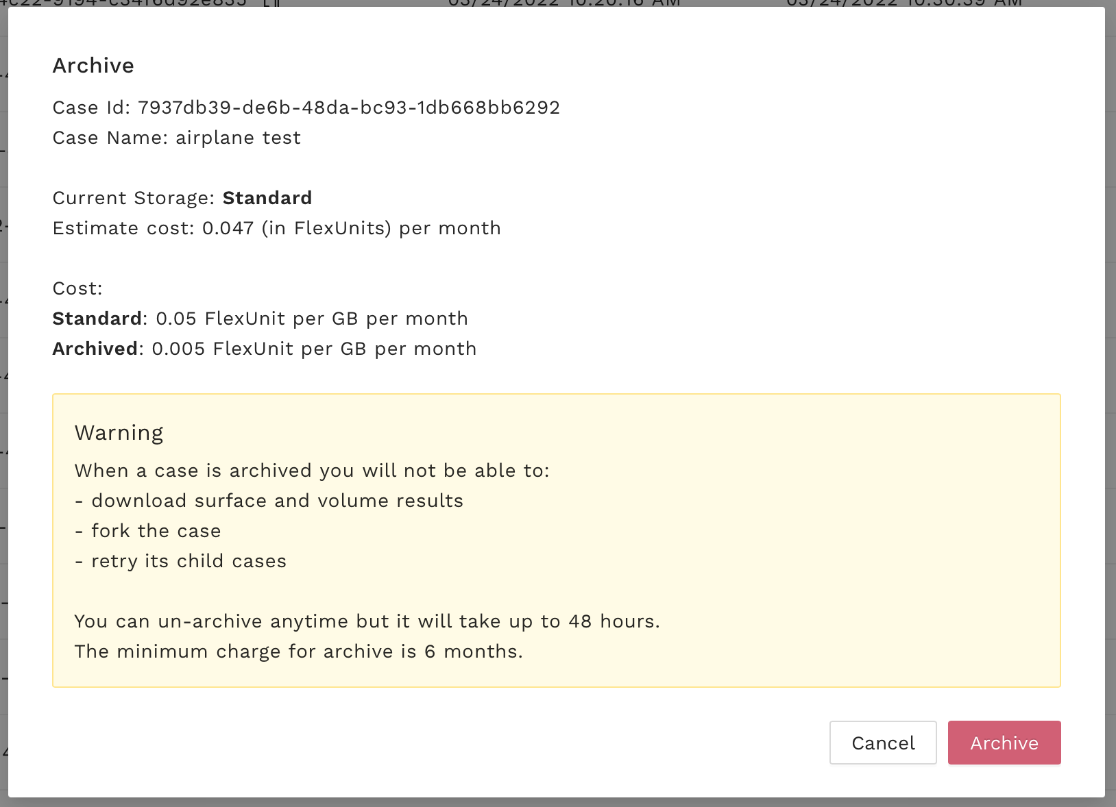 The minimum archive duration is 6 months (180 days). Restoring an archived case before this 6 month minimum will incur a one-time pro-rate charge for the remainder.