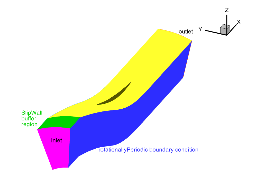 As you can see in the above top view of the flow domain, we have setup a slip wall buffer region (in green) in front of the CAD geometry (in yellow). This is a technique used to allow for better convergence. Since we have a given velocity at the inlet, when that velocity meets the noSlipWall at the hub and shroud then there will be a very large local gradient. That buffer region in green is set as a SlipWall boundary condition and it gives the code a little room to spread that large gradient and thus converge better.