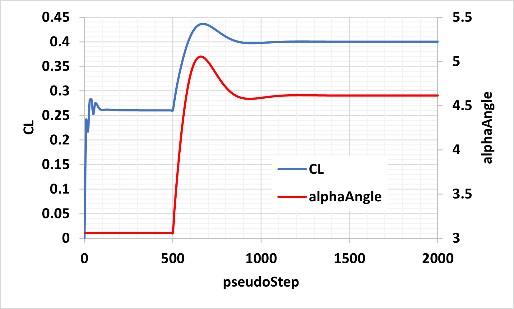The following figure shows the values of lift coefficient, CL, and angle of attack, alphaAngle, versus the steps, pseudoStep. As specified in the configuration file, the initial value of angle of attack is 3.06. With the specified user-defined dynamics, alphaAngle is adjusted to a final value of 4.61 so that CL = 0.4 is achieved.