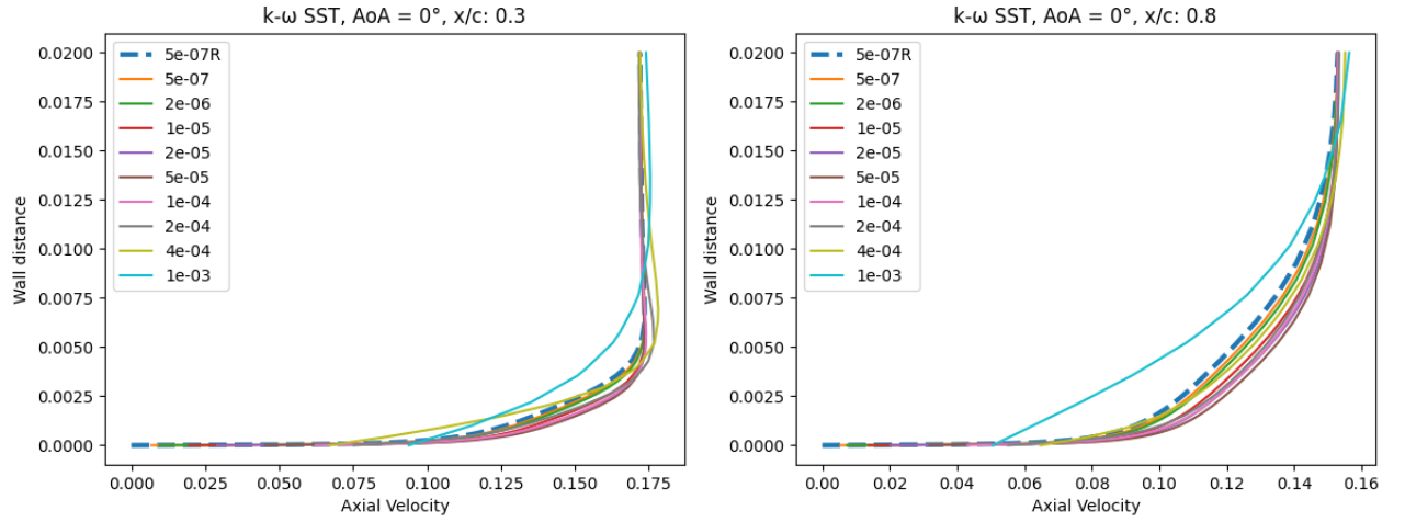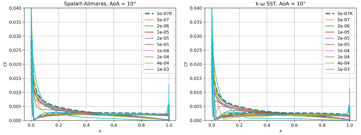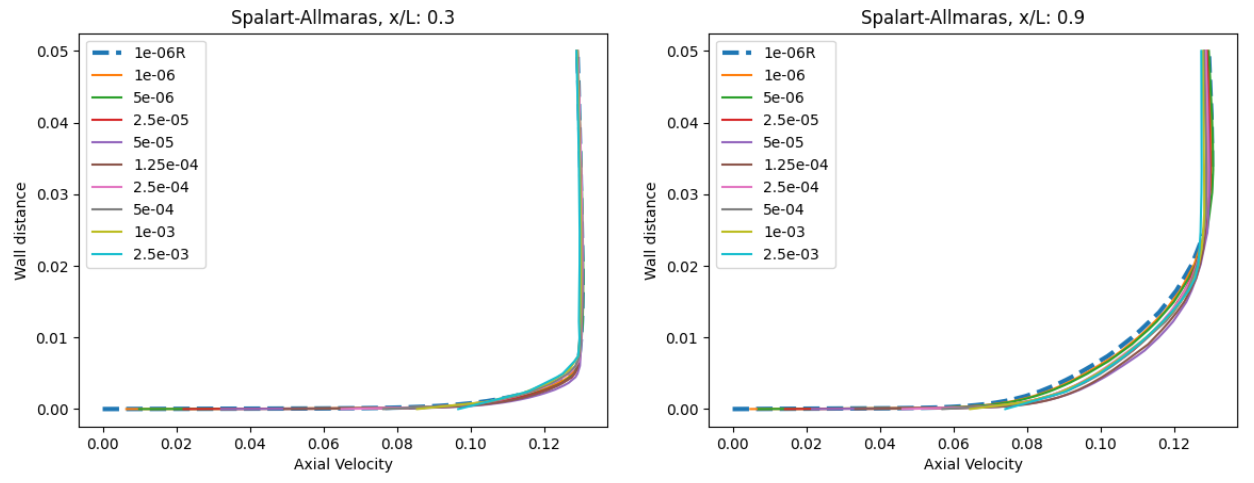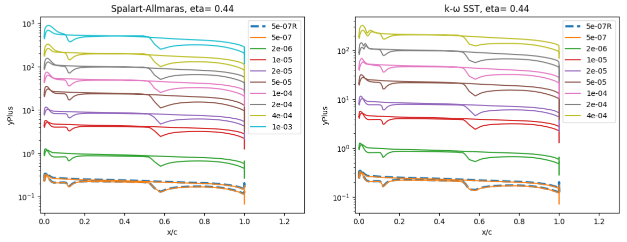As the wall spacing increases, the drag value is minorly underpredicted compared to the wall-resolved simulations, with the difference staying within 10% for the first two wall spacings. As the wall spacing is increased further, the error on the drag prediction increases, until spacings of 0.0002-0.0004 are reached, above which the error significantly reduces. Similar trends are observed between the Spalart-Allmaras and \(k-\omega\) SST turbulence models, although the error on the drag prediction appears to be slightly higher for the \(k-\omega\) SST turbulence model across nearly all wall spacings. At very high wall spacings, the \(k-\omega\) SST model appears to perform better than the Spalart-Allmaras model. To analyse these findings further, we first look at the \(y+\) and skin friction distributions, shown in Fig. 5.5.3-Fig. 5.5.4. A boundary layer profile in wall units according to the Law of the wall is also shown in Fig. 5.5.5 to aid the discussion.