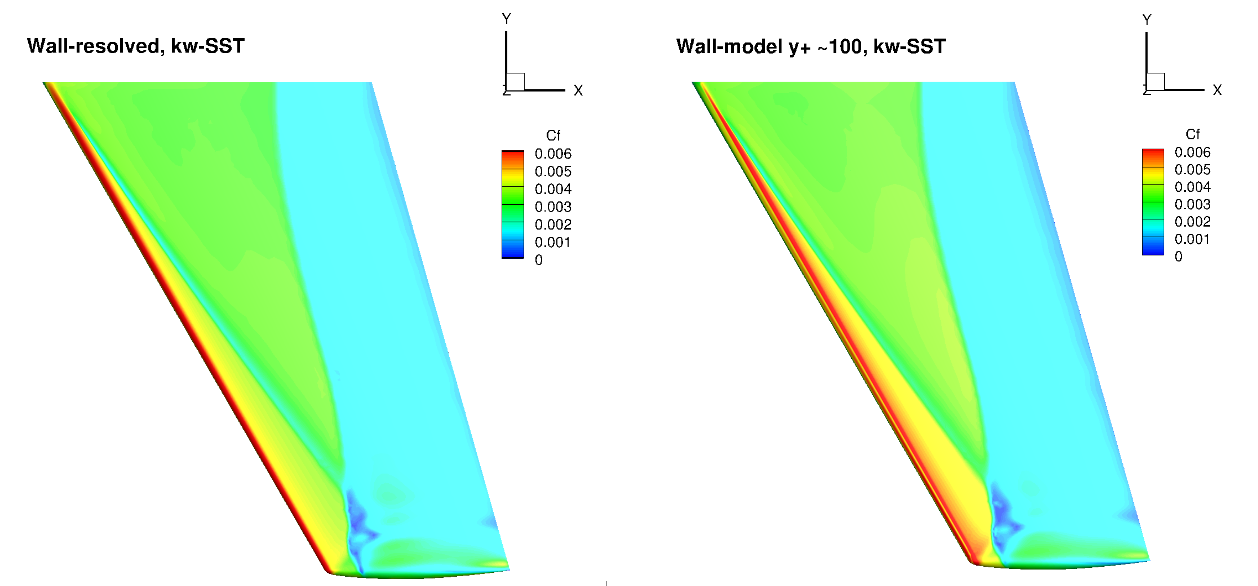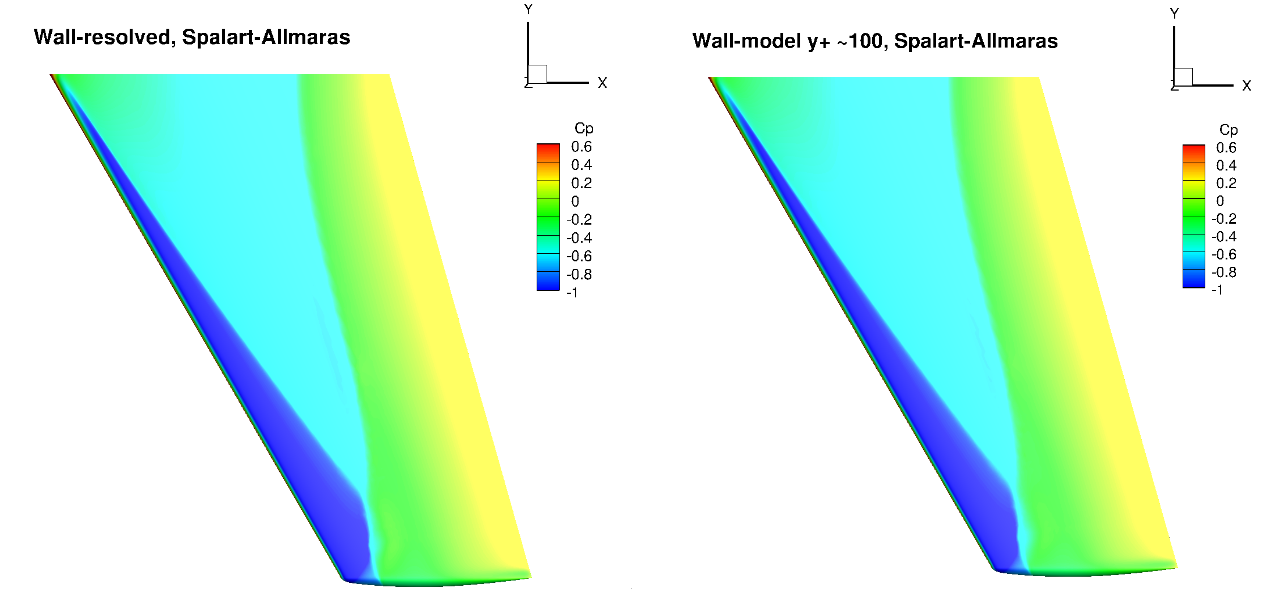• The use of the wall model typically has minor impact on the surface pressure prediction, but will lead to an error on the skin friction distributions. Generally, however, the skin friction trends are well captured based on the examined cases.