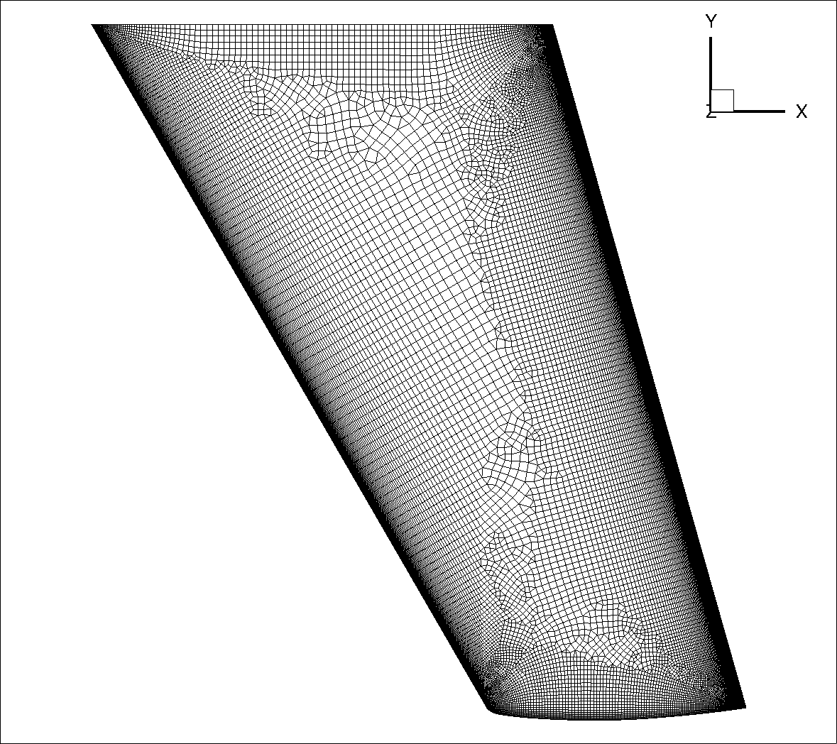 The surface grid used for both wall-resolved and wall-model simulations is fairly fine and has 152,601 nodes for a half-body. The spacing is fairly uniform over the entire vehicle. A set of volume grids were generated with spacing values ranging from 1e-06 to 2.5e-03, leading to grids ranging from 7.3 million nodes to 2.7 million nodes. The volumetric grid along the symmetry plane for the wall-resolved and wall model grids (spacing of 4e-04, approximately \(y^+\) ~100) is shown in Fig. 5.5.35