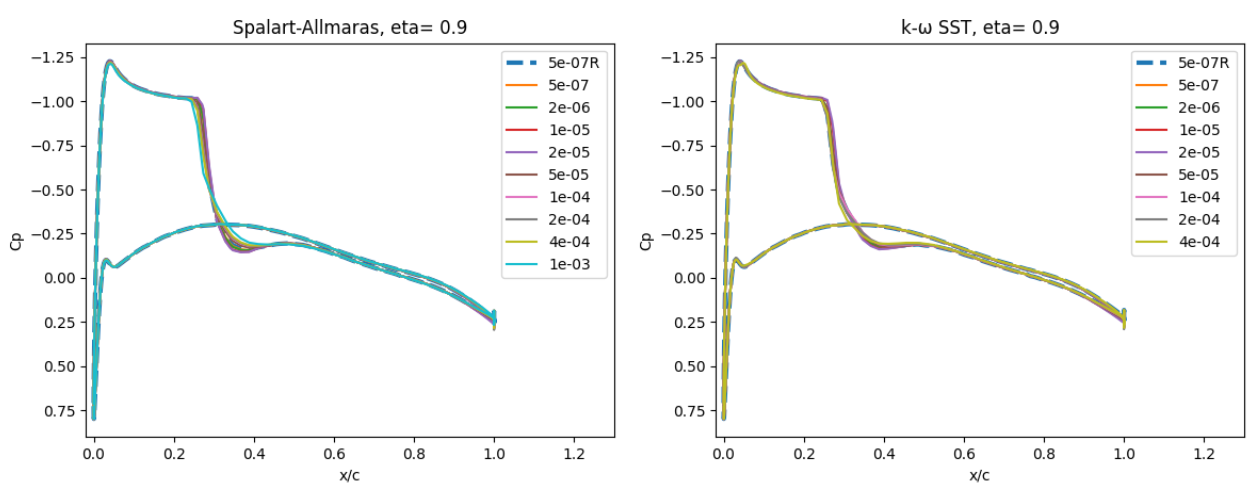 The volumetric grids for the wall-resolved and wall-model grids look fairly similar when looking at the grid around the entire aerofoil. The wall-model grid for a \(y^+\) of the 100, however, has fewer anisotropic layers, leading to a node count of 26,180 nodes (resolved grid is 59,654). The means that the computational cost on the wall-model grid will be less then half (additionally convergence will be faster due to a larger minimum volume). The simulations were performed using both the Spalart-Allmaras and \(k-\omega\) SST turbulence models. The CFL number was ramped up from 5 to 200 over 2000 pseudo-steps with a total number of pseudo-steps equal to 10000, even though in many cases, fewer pseudo-steps could have been used.