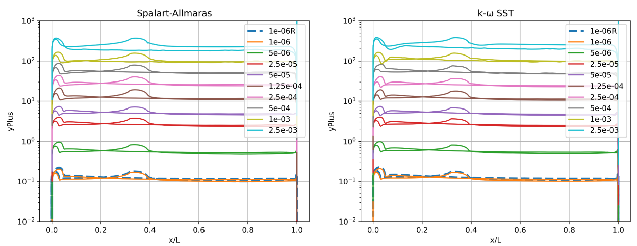 Fig. 5.5.3 Y+ values along the flat plate for wall-resolved (R) and wall-model simulations for the Spalart-Allmaras and \(k-\omega\) SST turbulence models.#