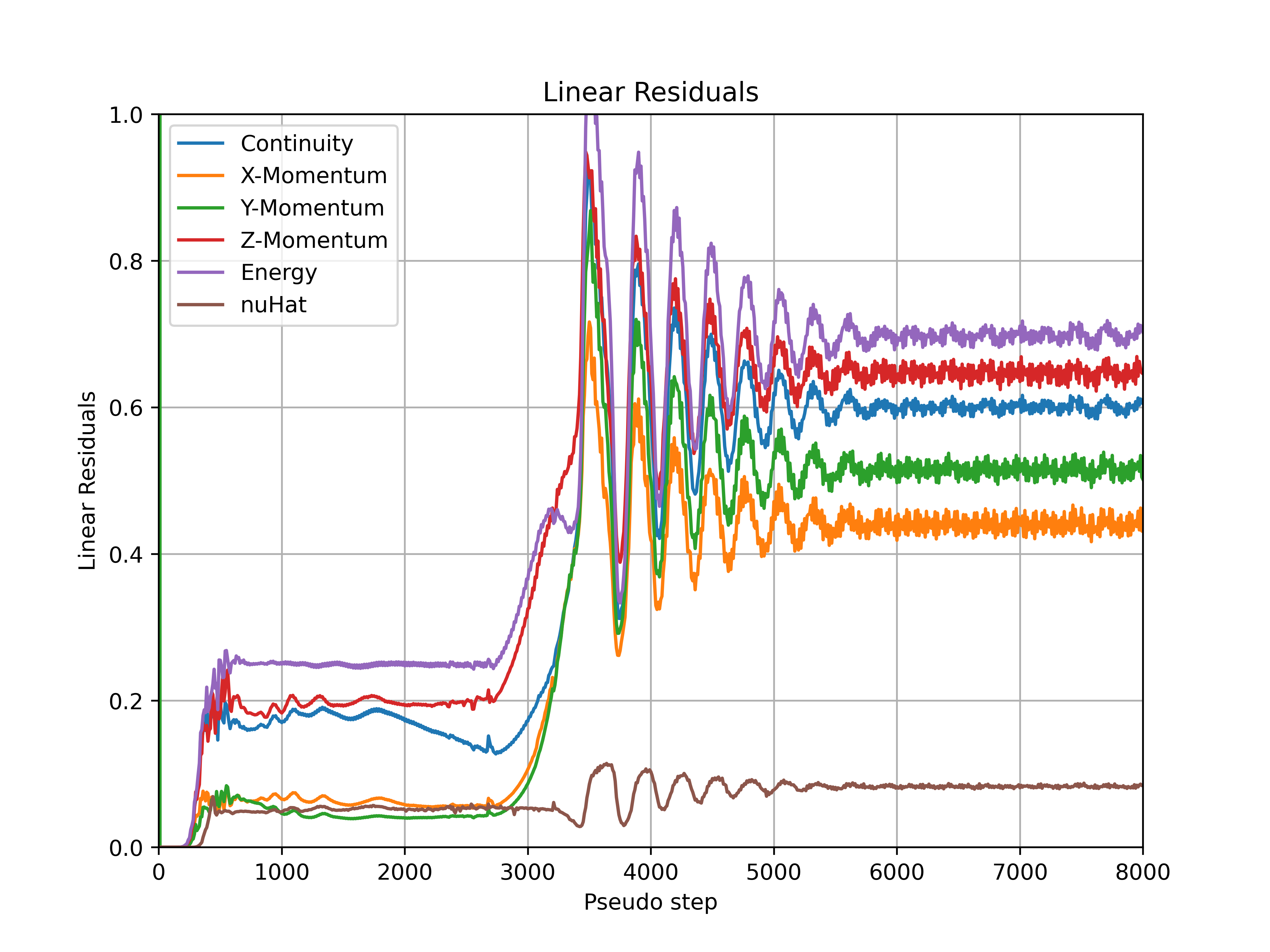 Fig. 7.6.5 Convergence of the linear residuals during the simulation for ONERAM6 wing at 10 degrees alpha.#