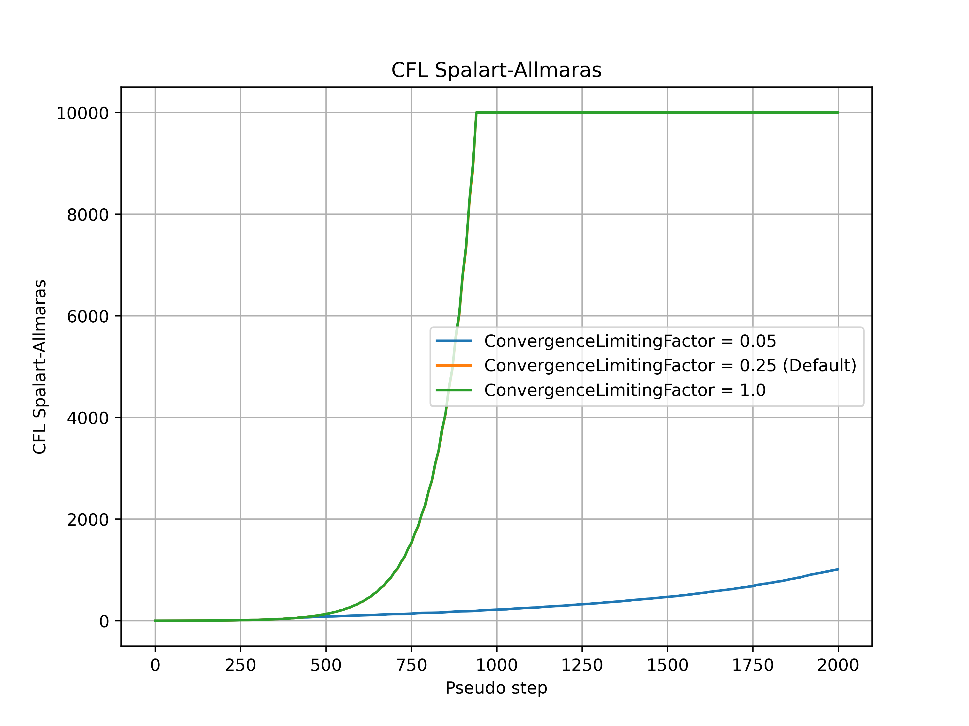 Fig. 7.3.6 Spalart-Allmaras CFL number during the simulation for a range of convergence_limiting_factor values.#