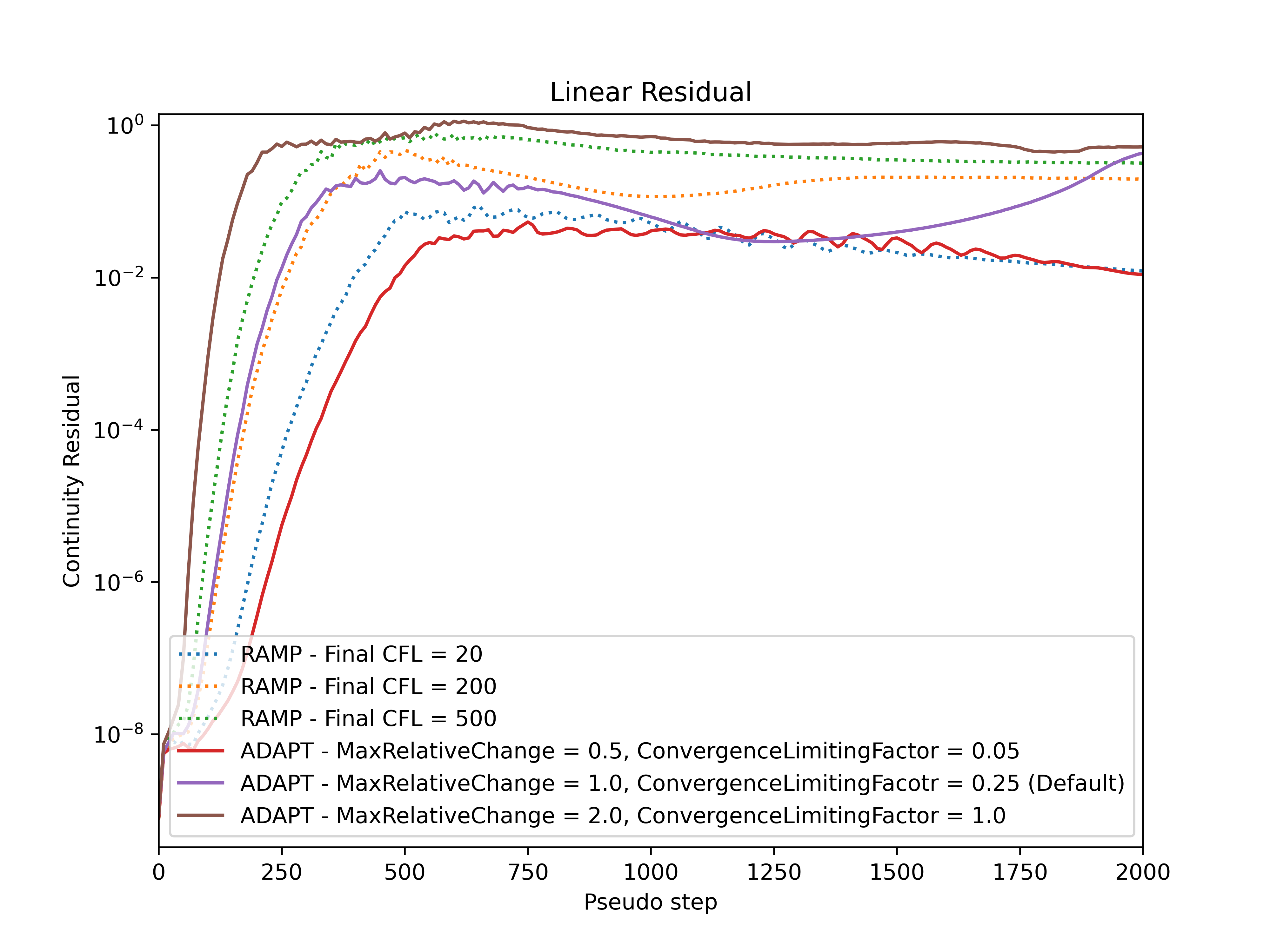 This approach adaptively adjusts the CFL number with criteria based on the linear residual values. The AdaptiveCFL ramping approach offers several advantages when compared to RampCFL:
