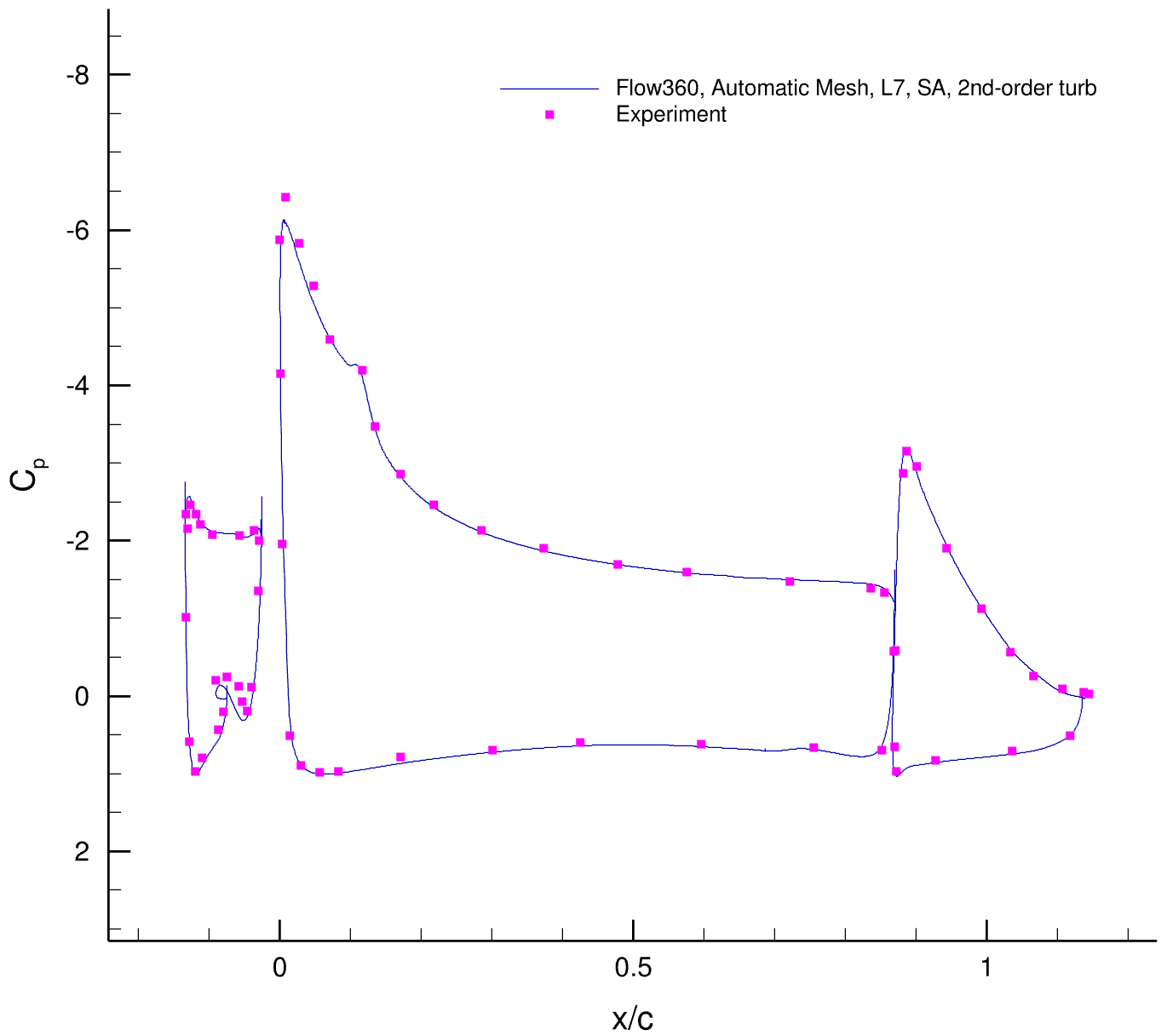 There is no experimental data for this case and we only compare CFD results. The second case is 30P30N High-Lift Configuration, for which we have experimental data to compare to. The third case is the GA(W)-2 airfoil with a 30% fowler flap for which we also have experimental data.