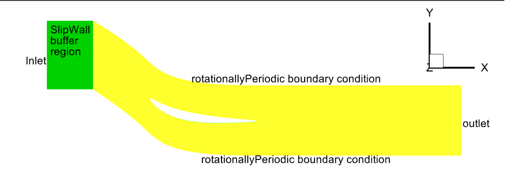 As you can see in the above top view of the flow domain, we have setup a slip wall buffer region (in green) in front of the CAD geometry (in yellow). This is a technique used to allow for better convergence. Since we have a given velocity at the inlet, when that velocity meets the noSlipWall at the hub and shroud then there will be a very large local gradient. That buffer region in green is set as a SlipWall boundary condition and it gives the code a little room to spread that large gradient and thus converge better.