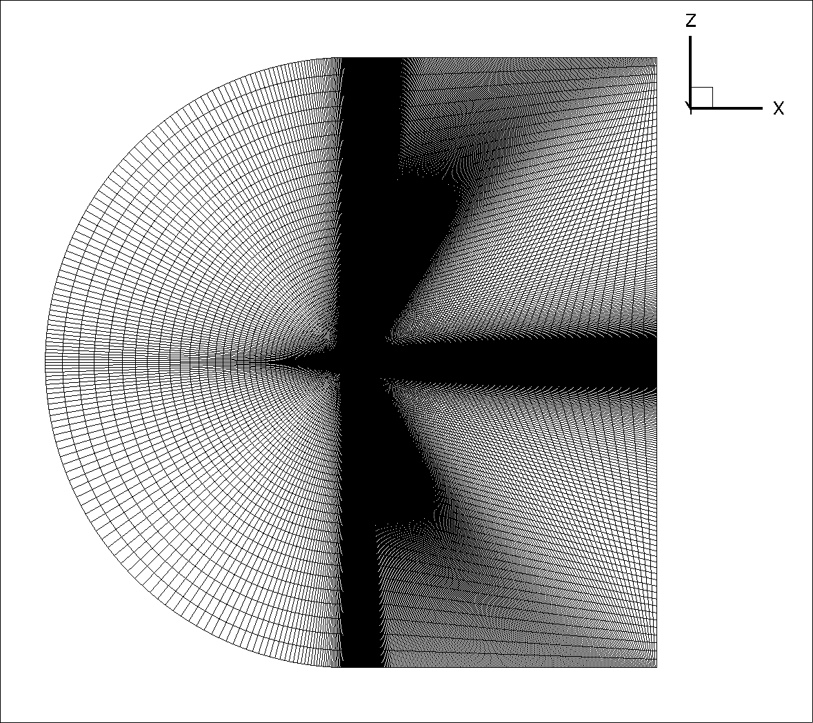 A single C-Topology grid is used, available at the NACA4412 case grid download page of the TMR website. The second finest grid (897 by 257 points) is used to perform direct comparisons with CFL3D and FUN3D on the same grid. The grid used in Flow360 was modified for the names and number of boundaries, and is available here A detailed grid convergence study is not performed here. The grid far-view and near-view is shown in Fig. 5.2.1.