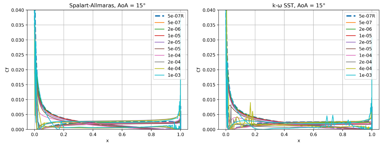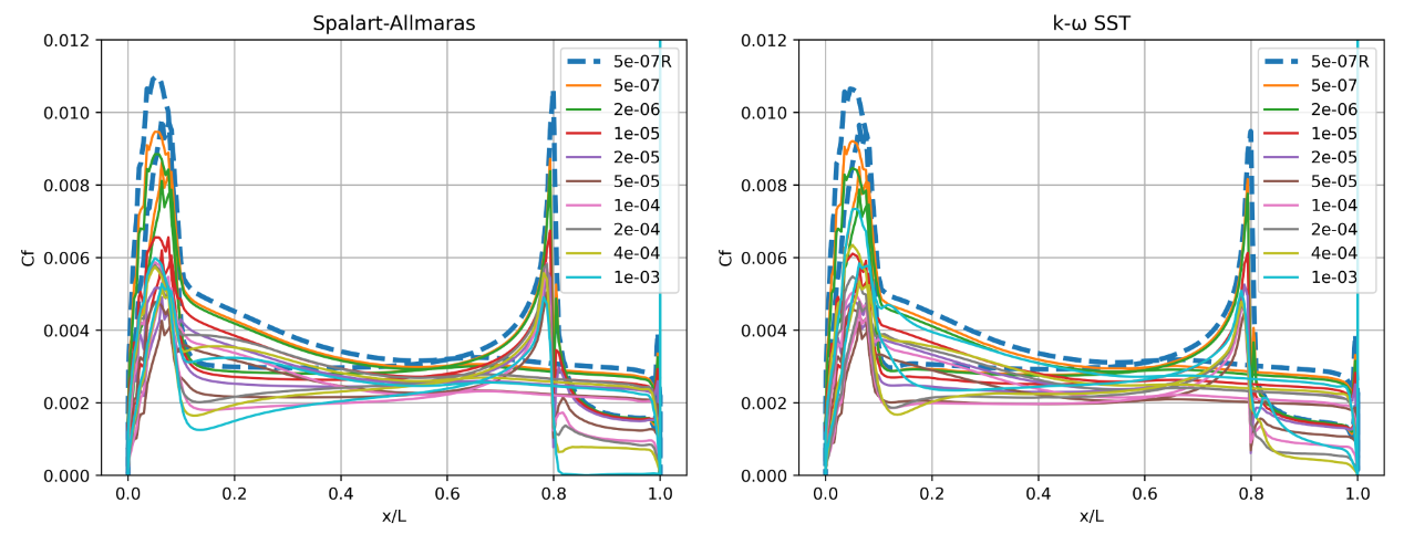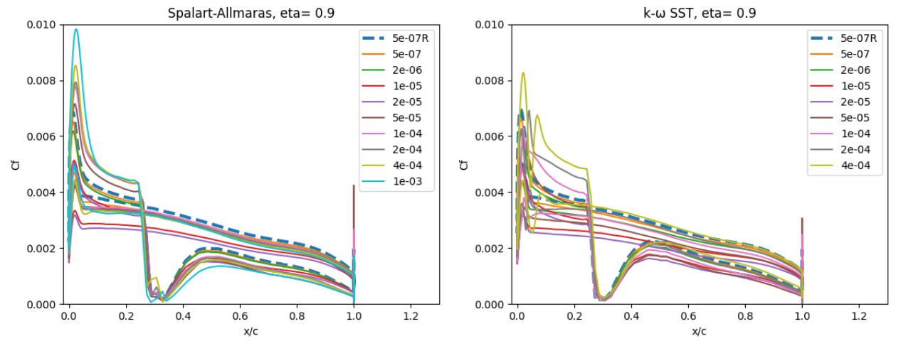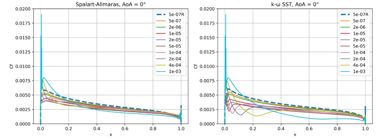 As the number of points in the wall normal direction is fixed, the wall-model grid has a finer spacing away from the boundary layer due to the higher wall-normal spacing at the flat plate. The simulations were performed using both the Spalart-Allmaras and \(k-\omega\) SST turbulence models. The CFL number was ramped up from 1 to 500 over 2000 pseudo-steps with a total number of pseudo-steps equal to 5000.