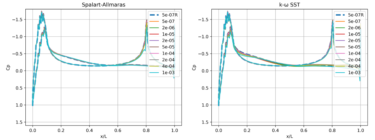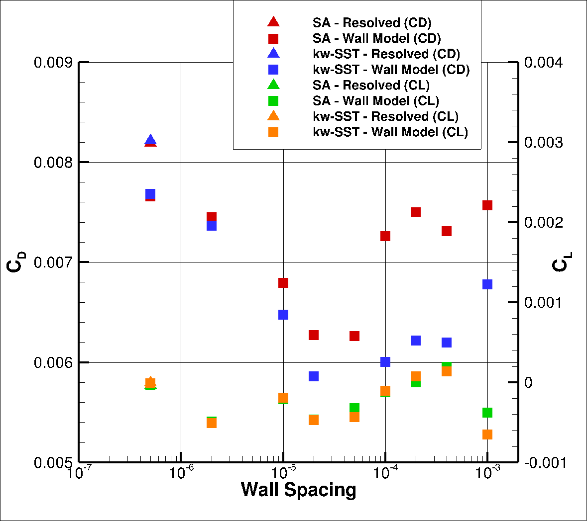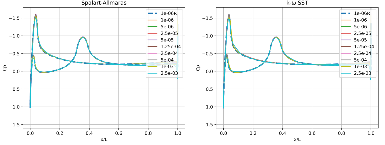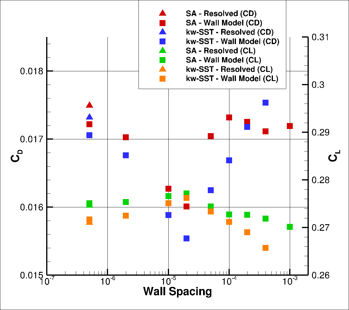 The integrated loads show excellent agreement for the wall-model simulations when compared to the wall-resolved simulations. At low wall spacings, both the lift and drag coefficients decreases with increasing wall spacing, until a spacing of 5e-05. At a spacing of 0.0001 both the drag and lift start to increase with excellent agreement with the wall-resolved simulations, which slightly worsens at the highest examined wall spacing. The best agreement is seen at a wall spacing of 0.0001 for the Spalart-Allmaras turbulence model and 0.0002 for the \(k-\omega\) SST turbulence model. To examine these differences in greater detail, first the \(y^+\), surface pressure coefficient and skin friction coefficient predictions are extracted along the centerline (y=0), shown in Fig. 5.5.29-Fig. 5.5.31.