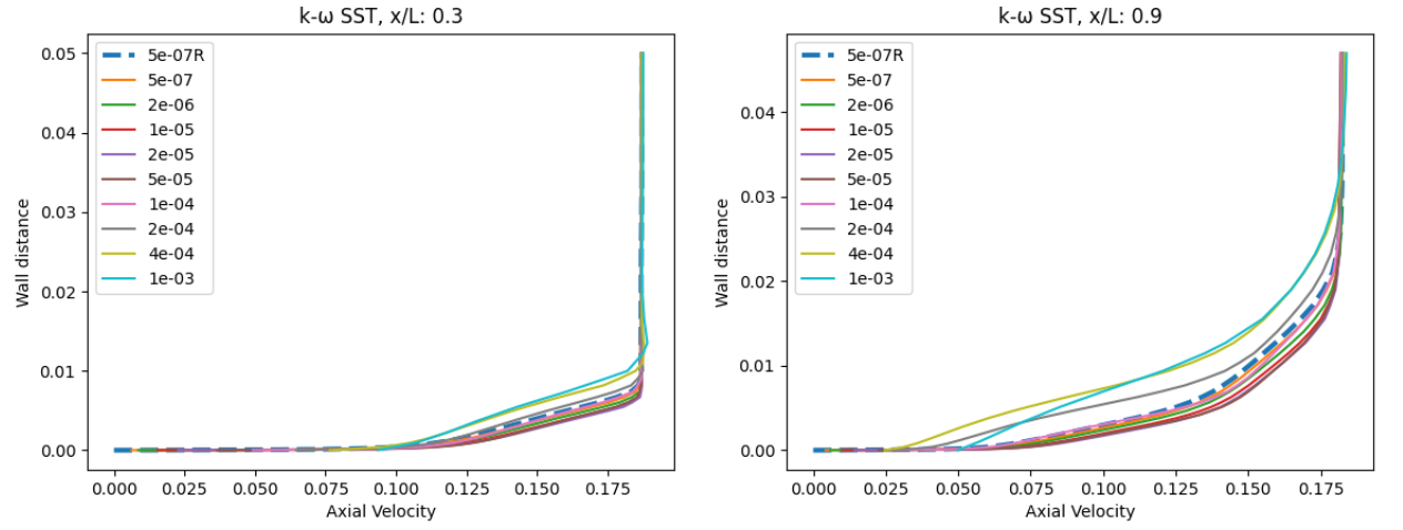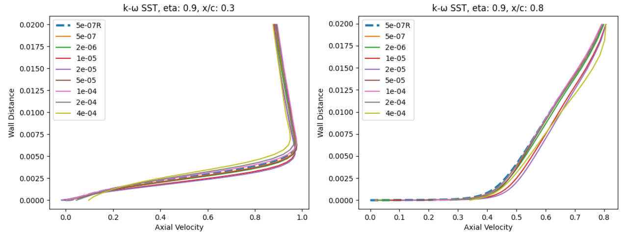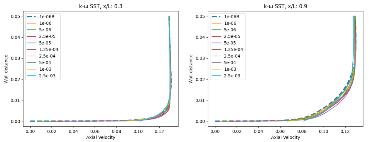 The first observation is that for the wall model simulations, the axial velocity is non-zero at the wall as discussed in the wall model formulation. Very good agreement is obtained for the velocity profiles across a range of wall spacings, with the wall model simulations predicting a slightly higher velocity magnitude in the boundary layer. The poorest agreement is seen for wall spacings which are equivalent to the first layer thickness being in the buffer layer. Comparing the Spalart-Allmaras and \(k-\omega\) SST results, it can be seen that the velocity increase is more linear for the \(k-\omega\) SST model. The turbulent eddy viscosity ratio profiles, are also well resolved by the wall model simulations. The peak eddy viscosity ratio is typically slightly underpredicted although wall spacings of 2e-04 and 4e-04 give reasonably good agreement with the wall-resolved simulations. Similar peak values are predicted by the Spalart-Allmaras and \(k-\omega\) SST turbulence model simulations, although the \(k-\omega\) SST predictions lead to a sharper profile. The profile is slightly underesolved for the highest wall spacing. Since, only the first layer height is changed in the mesh with a constant growth rate, high wall spacings also lead to a coarser mesh across the boundary layer. This is why a discontinuous curve is seen at the highest wall spacing of 2e-03. A more qualitative comparison of the turbulent eddy viscosity ratio profiles is shown in Fig. 5.5.8 for wall-resolved simulations and the wall-model simulation with a wall spacing of 4e-04.